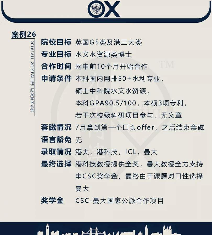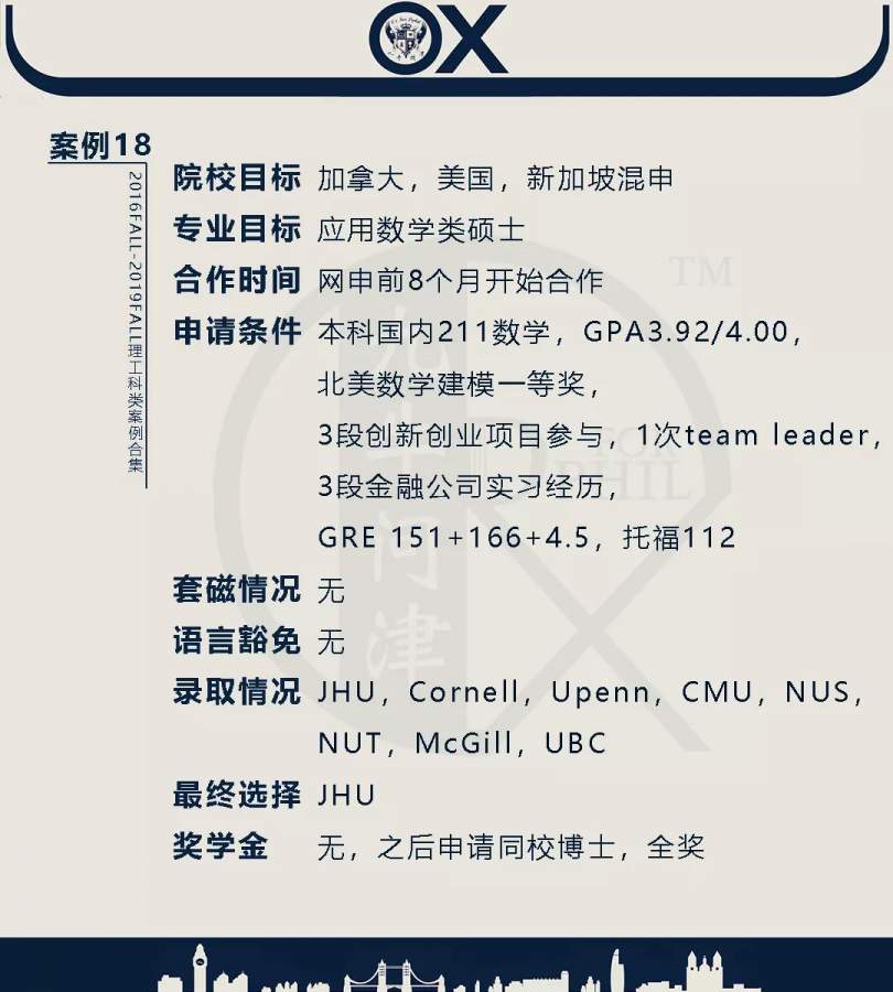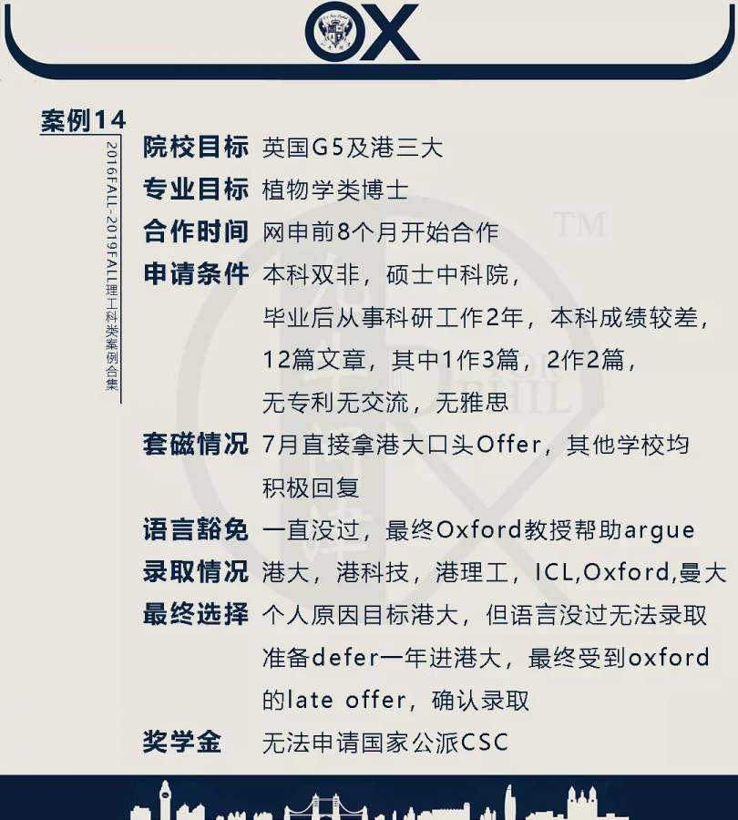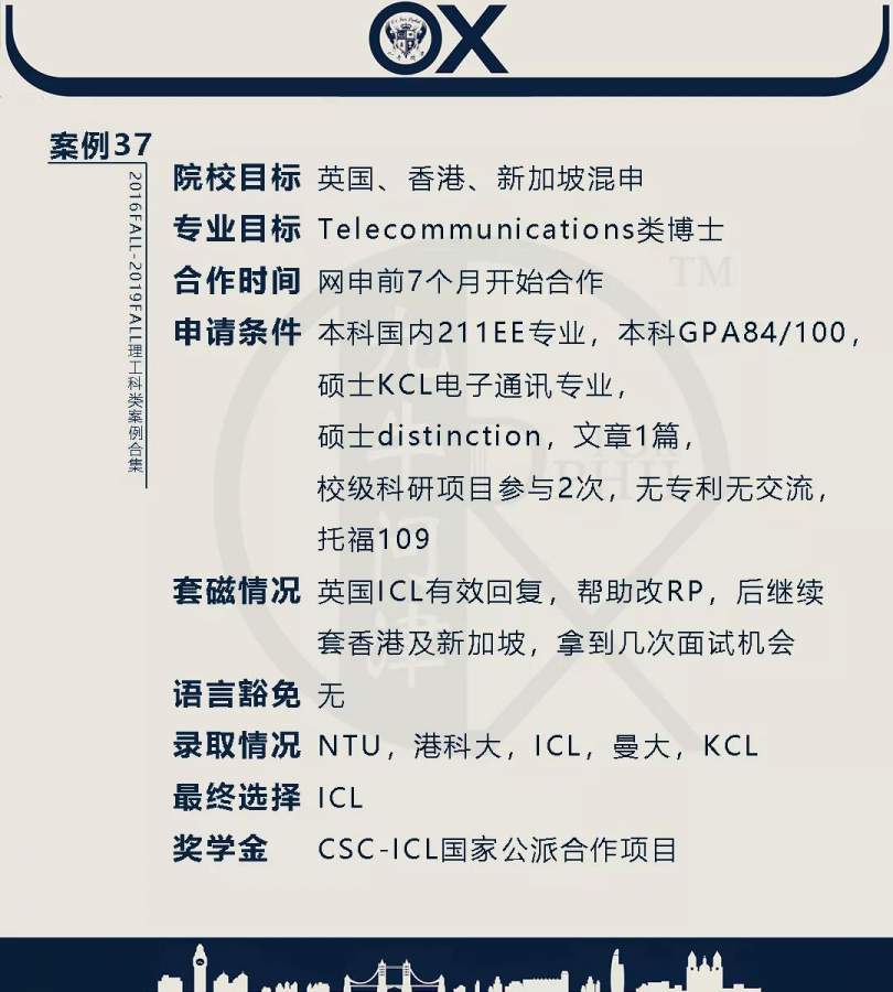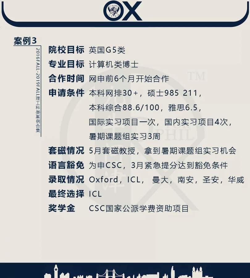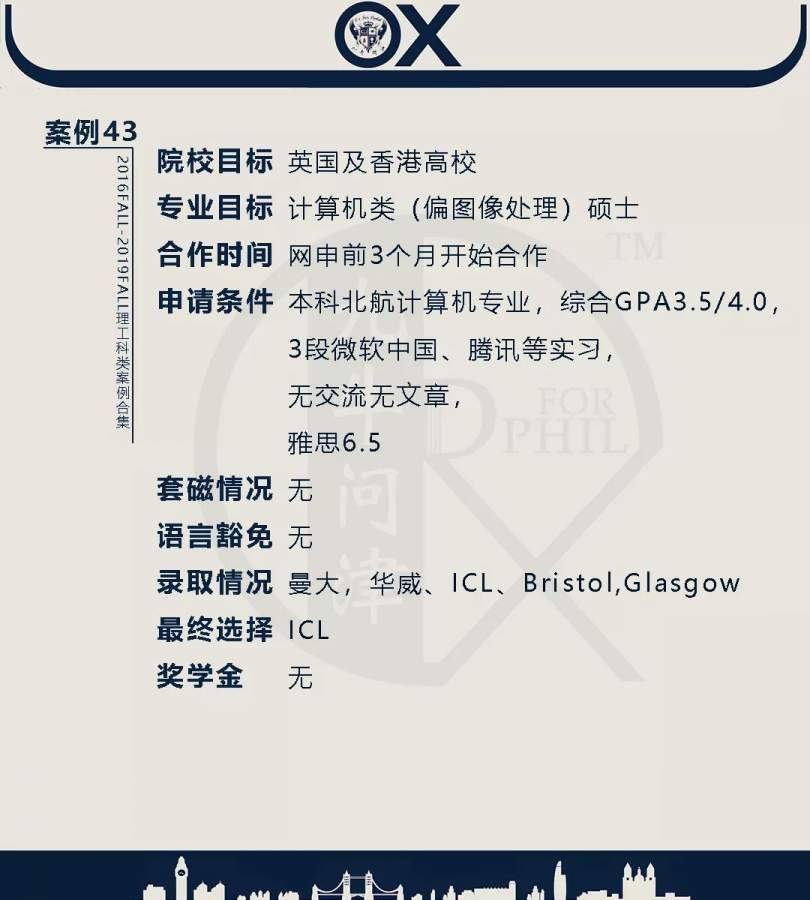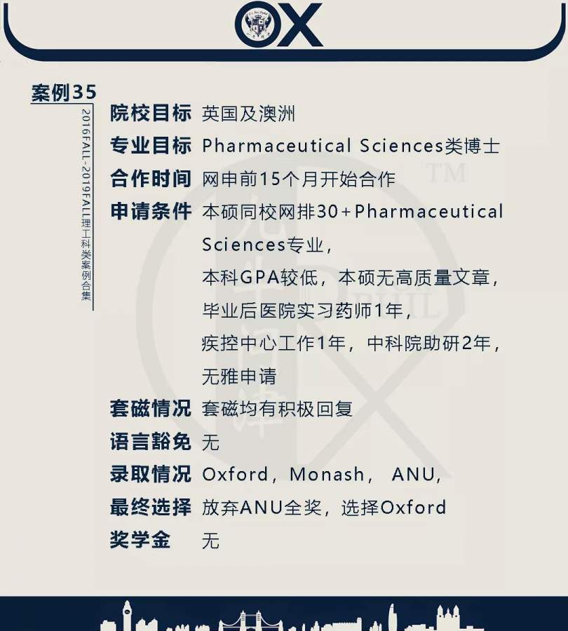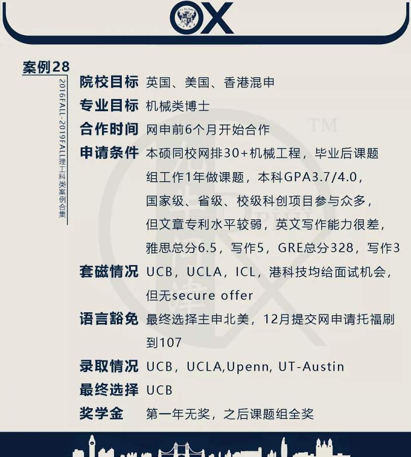 【郑重申明】 1、文中为截止2019FALL对应专业部分优秀录取案例,更多案例正在整理中,将持续更新; 2、文中所有案例为经过团队真实学员允许后采集、编辑、整理而来;应部分学员要求,重要信息部分已删除; 3、文中所有案例版权归九牛问津团队所有,未经允许,严禁任何形式转载或者盗用,违者必究。 申明: 1、本系列所有文章皆为100%原创 2、首发于知乎专栏《牛津公派博士小课堂》及公众号【九牛问津】 3、我已加入“维权骑士”的版权保护计划。未经允许,严禁任何形式转载或者盗用,违者必究。 4、希望各位准备留学的学弟学妹可以作为自身硬件定位的参考 |
