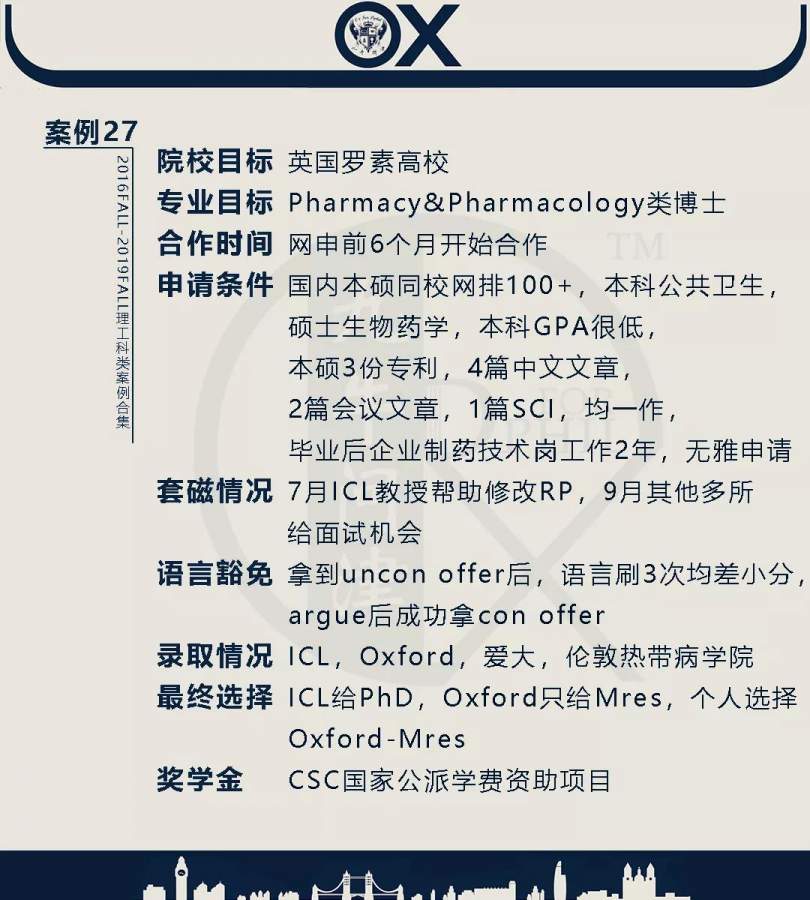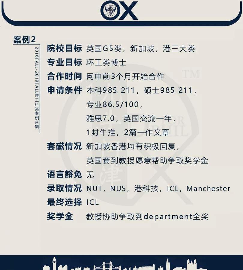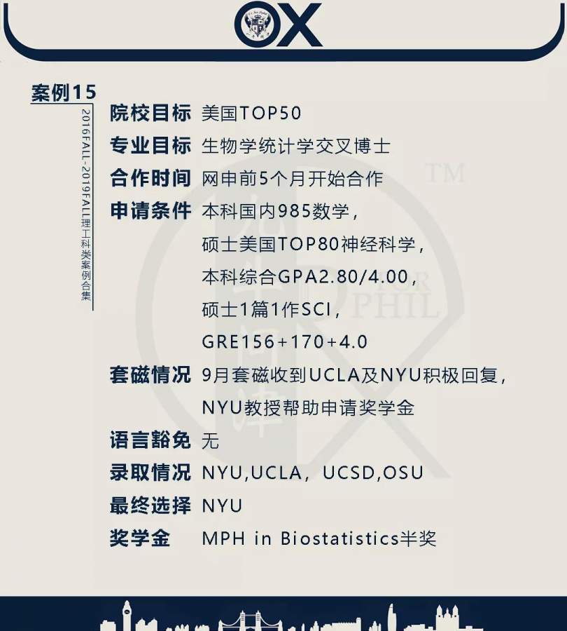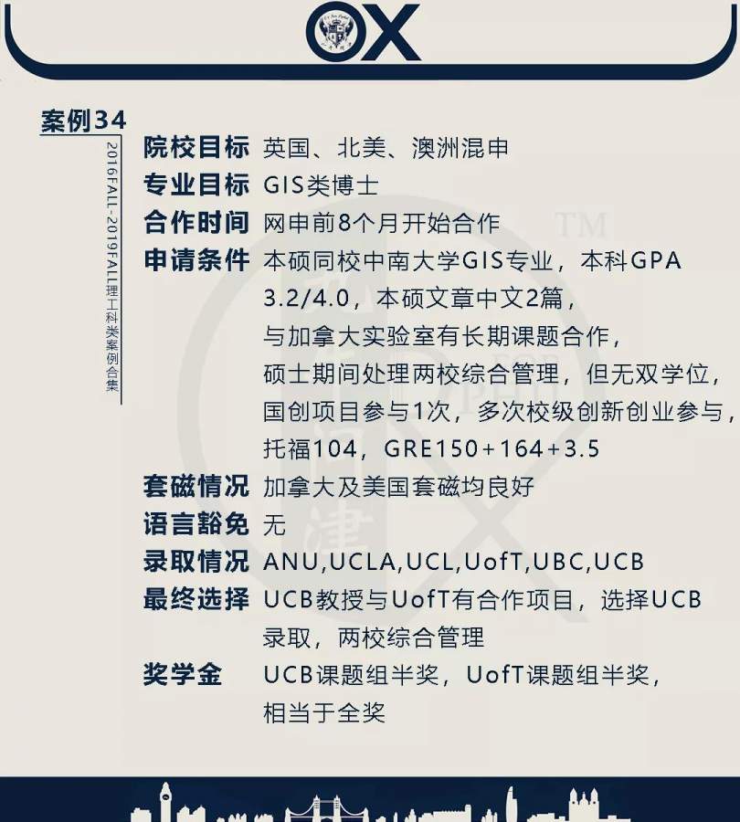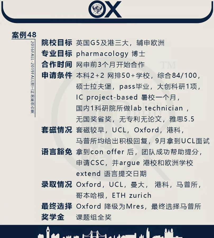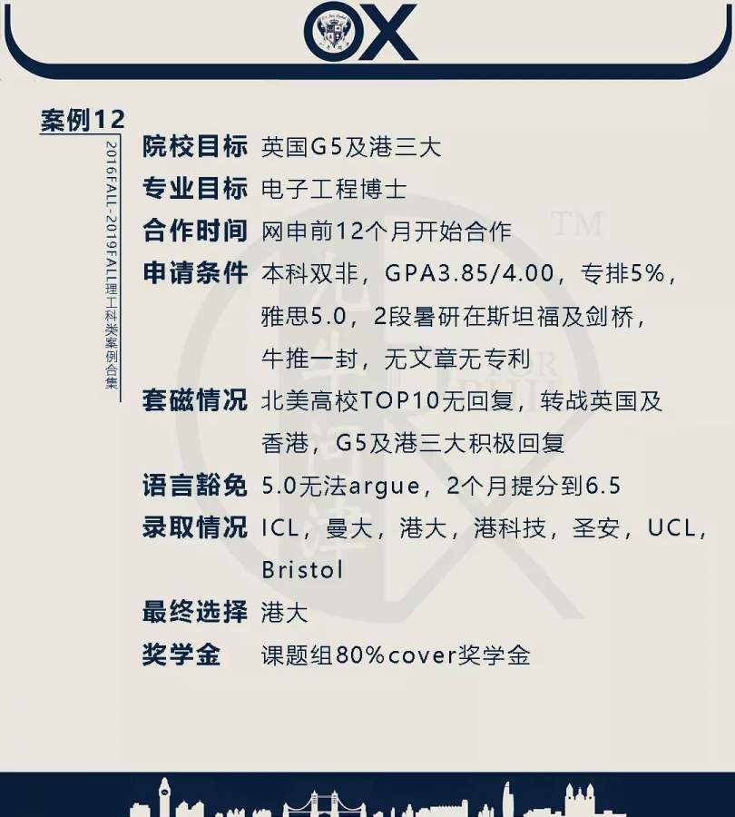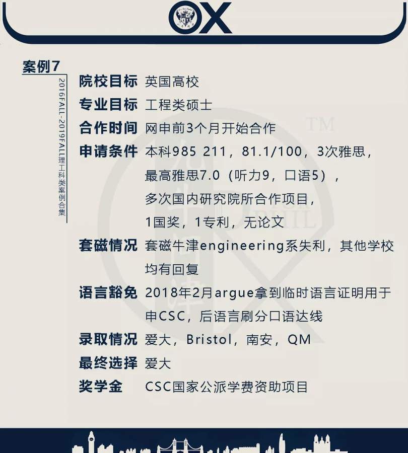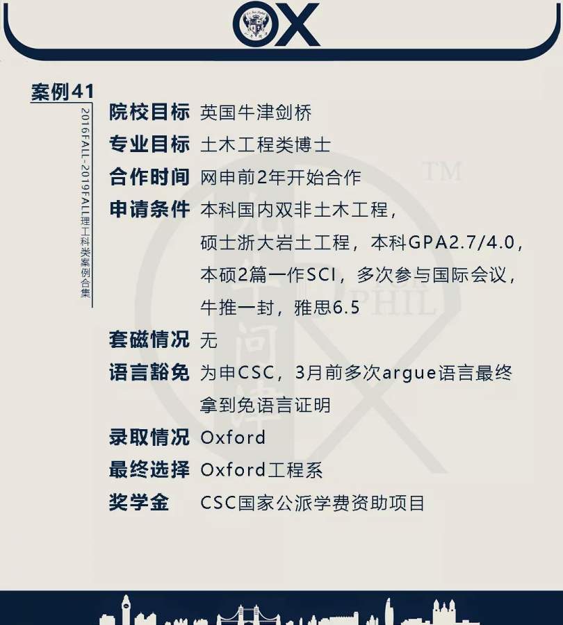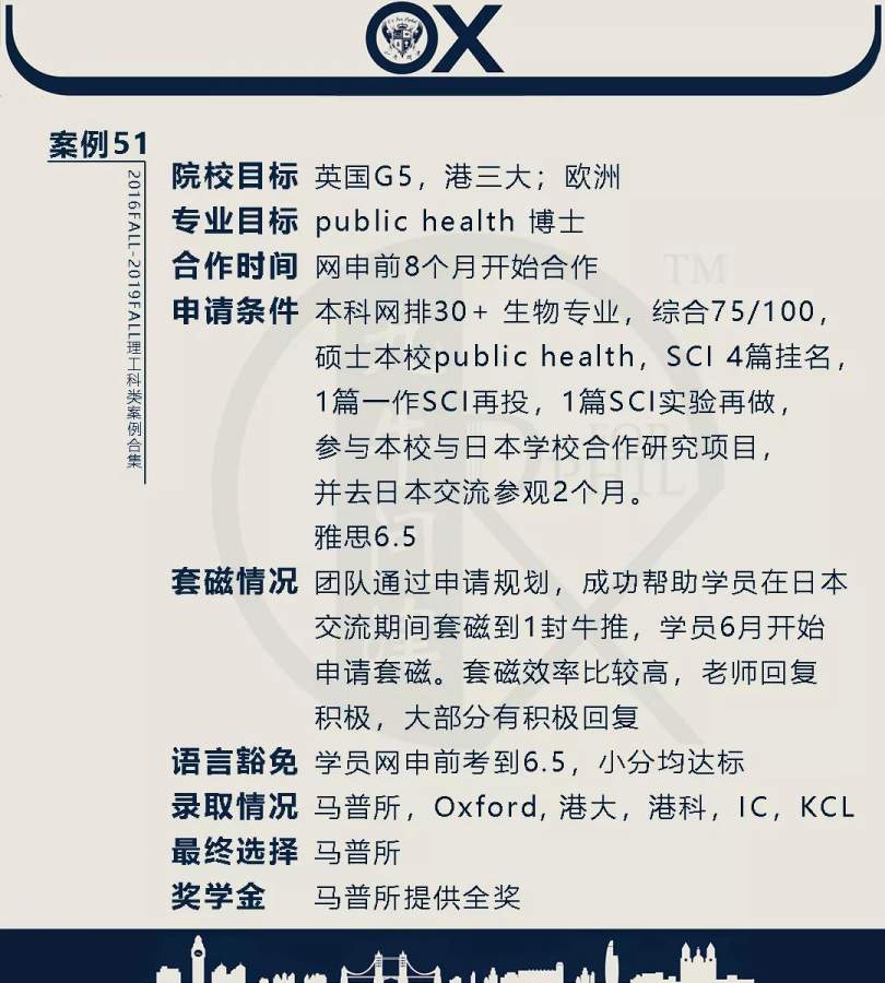 【郑重申明】 1、文中为截止2019FALL对应专业部分优秀录取案例,更多案例正在整理中,将持续更新; 2、文中所有案例为经过团队真实学员允许后采集、编辑、整理而来;应部分学员要求,重要信息部分已删除; 3、文中所有案例版权归九牛问津团队所有,未经允许,严禁任何形式转载或者盗用,违者必究。 申明: 1、本系列所有文章皆为100%原创 2、首发于知乎专栏《牛津公派博士小课堂》及公众号【九牛问津】 3、我已加入“维权骑士”的版权保护计划。未经允许,严禁任何形式转载或者盗用,违者必究。 4、希望各位准备留学的学弟学妹可以作为自身硬件定位的参考 |