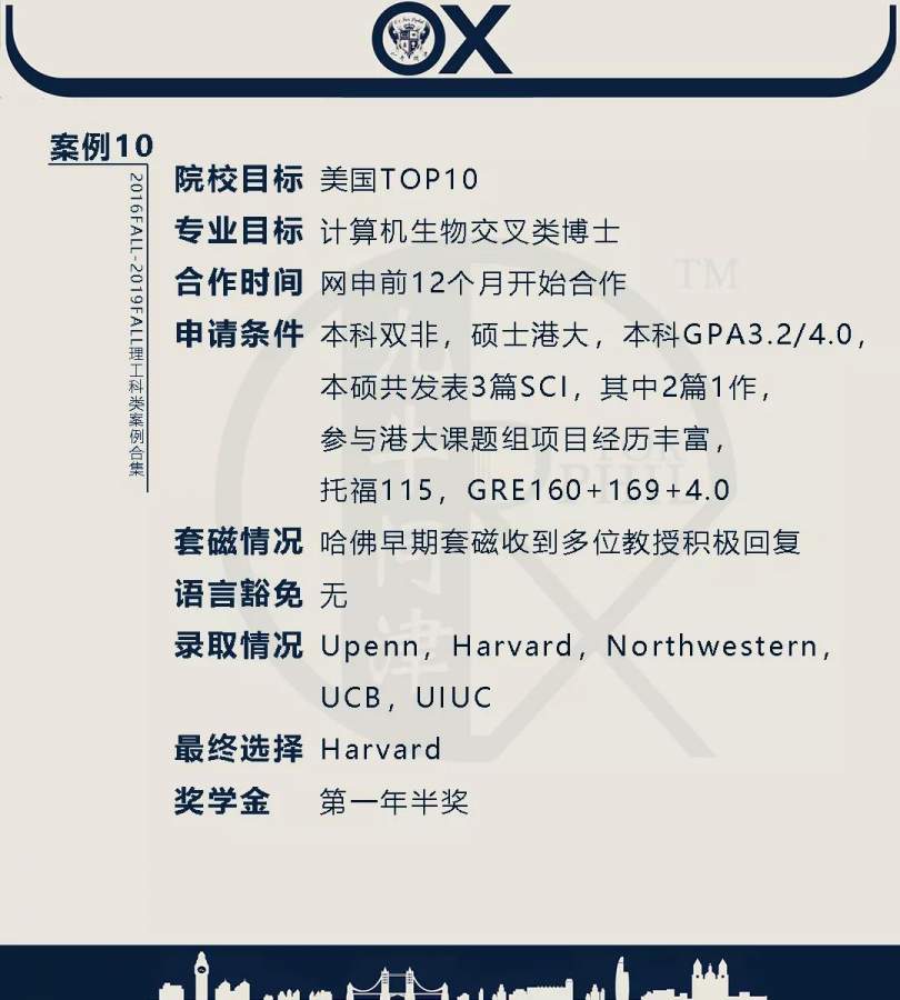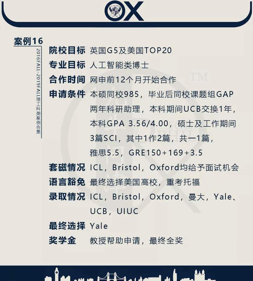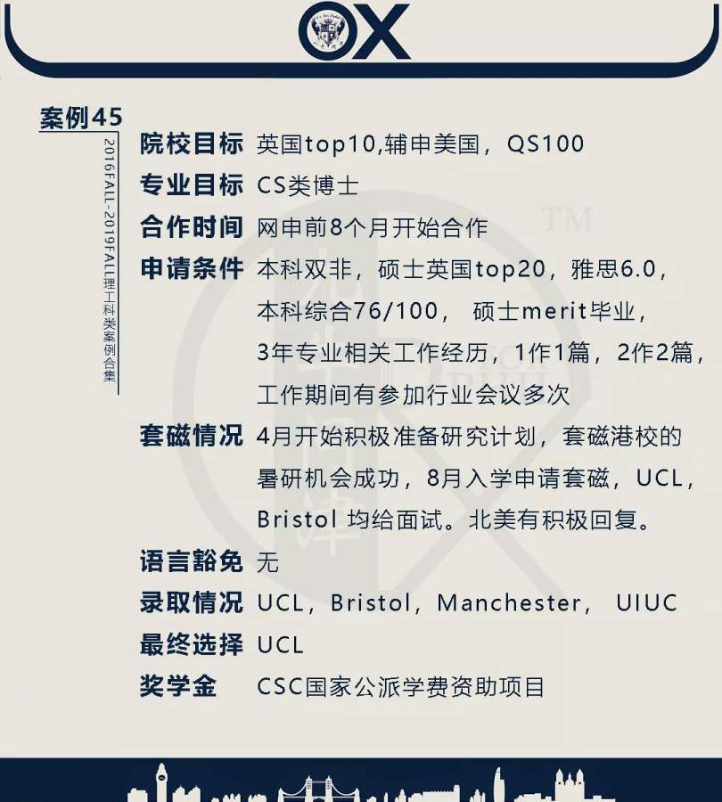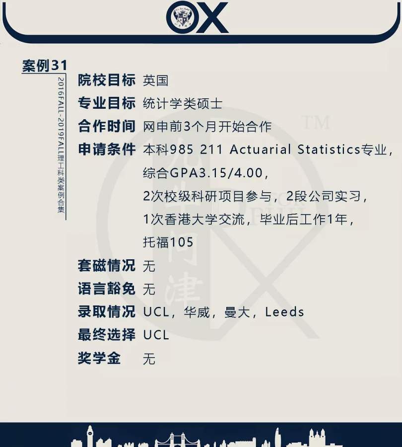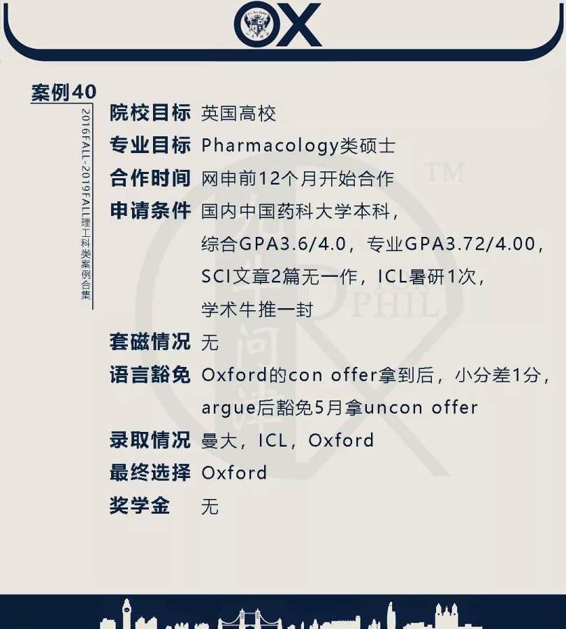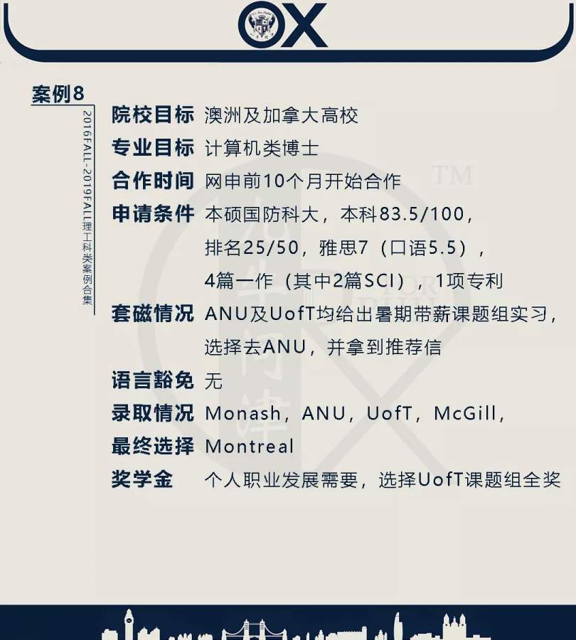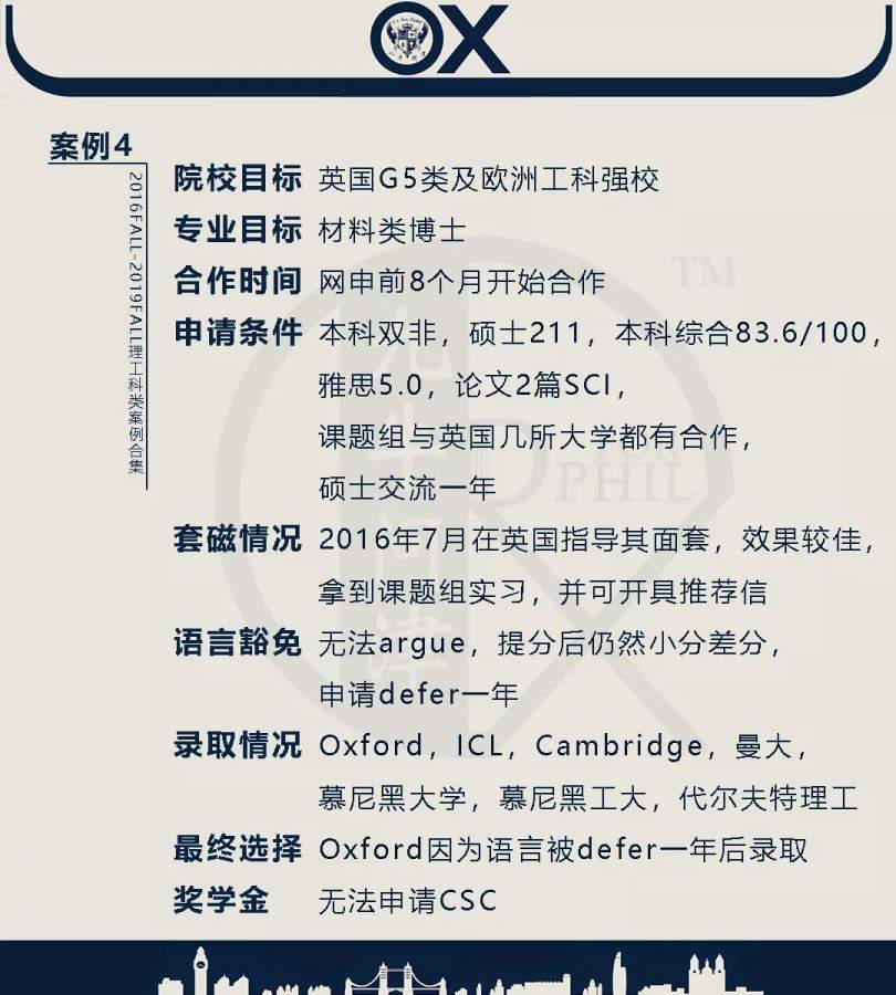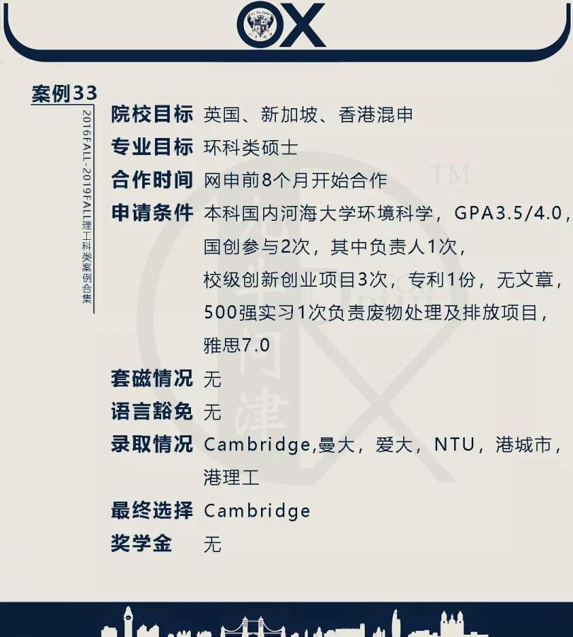 【郑重申明】 1、文中为截止2019FALL对应专业部分优秀录取案例,更多案例正在整理中,将持续更新; 2、文中所有案例为经过团队真实学员允许后采集、编辑、整理而来;应部分学员要求,重要信息部分已删除; 3、文中所有案例版权归九牛问津团队所有,未经允许,严禁任何形式转载或者盗用,违者必究。 申明: 1、本系列所有文章皆为100%原创 2、首发于知乎专栏《牛津公派博士小课堂》及公众号【九牛问津】 3、我已加入“维权骑士”的版权保护计划。未经允许,严禁任何形式转载或者盗用,违者必究。 4、希望各位准备留学的学弟学妹可以作为自身硬件定位的参考 |