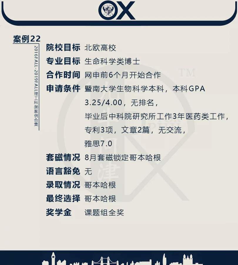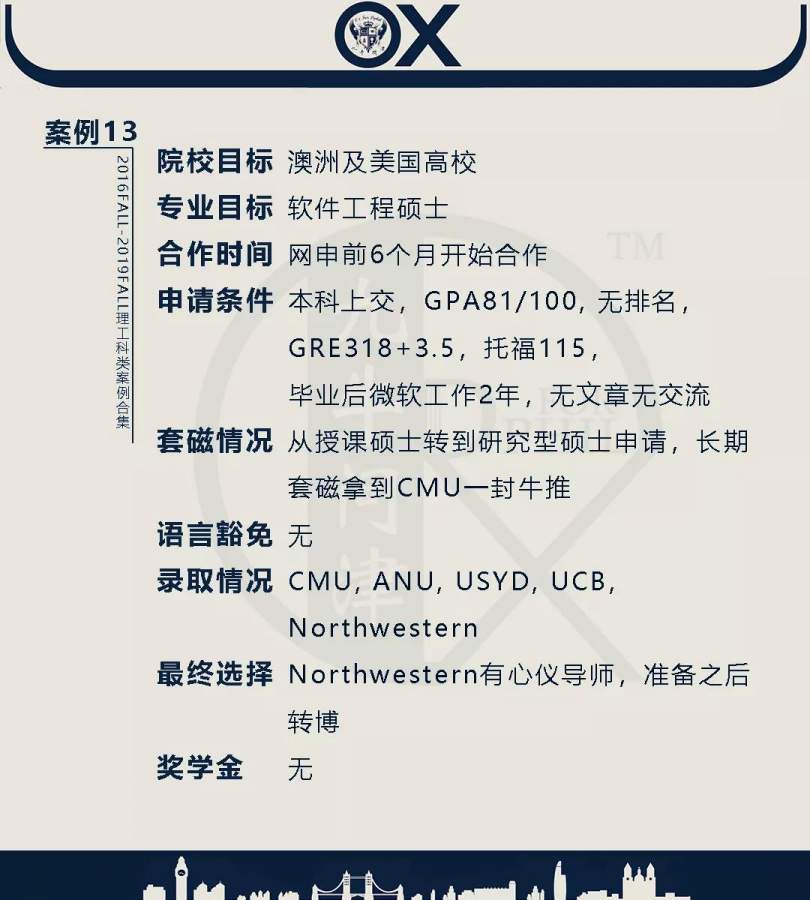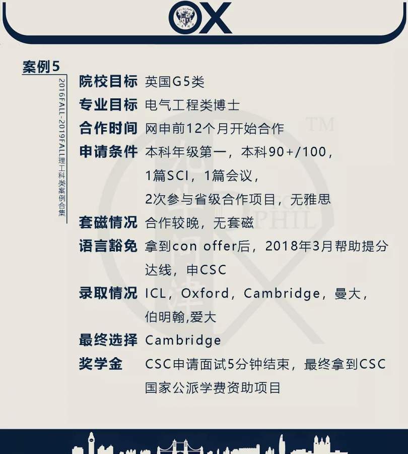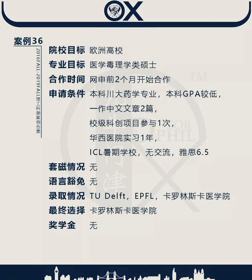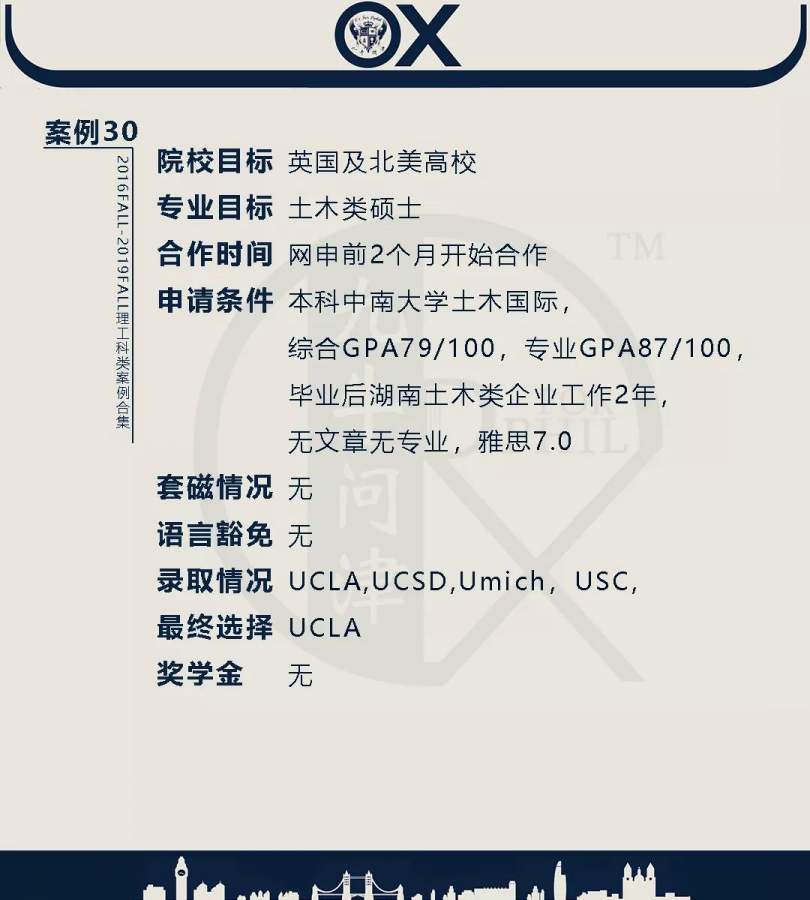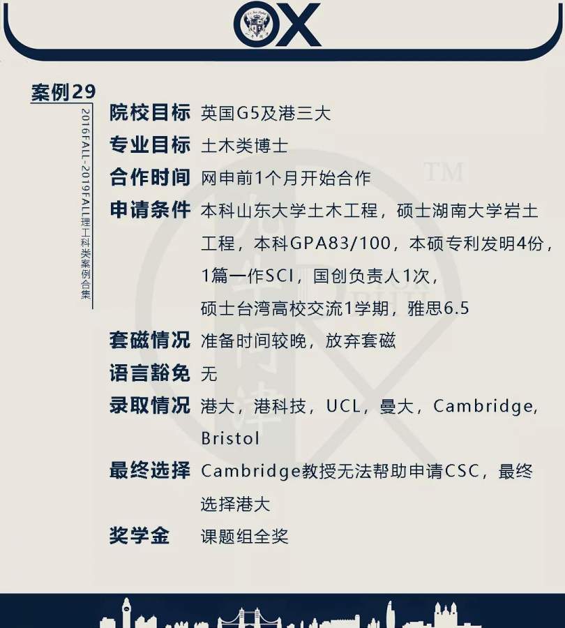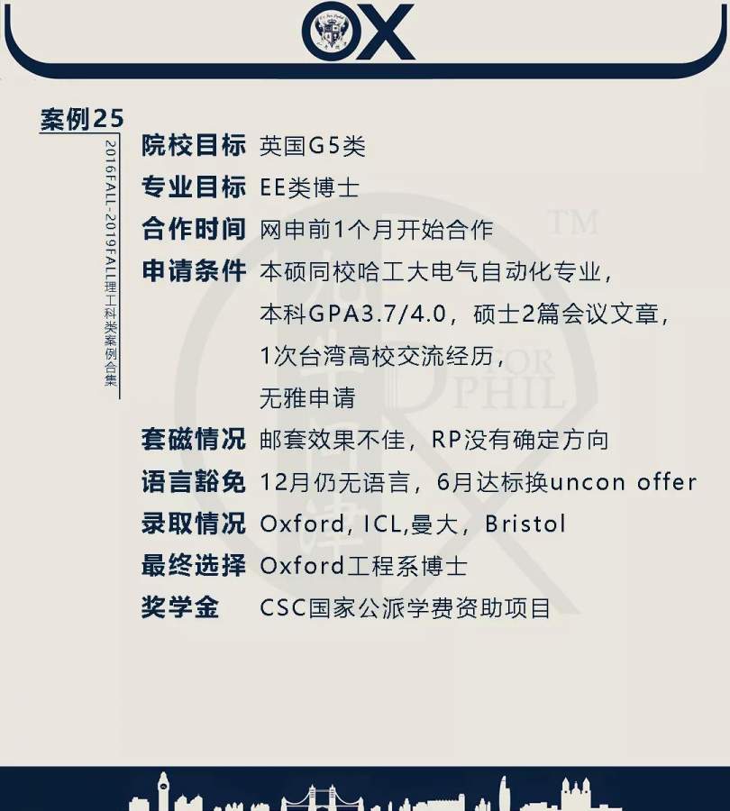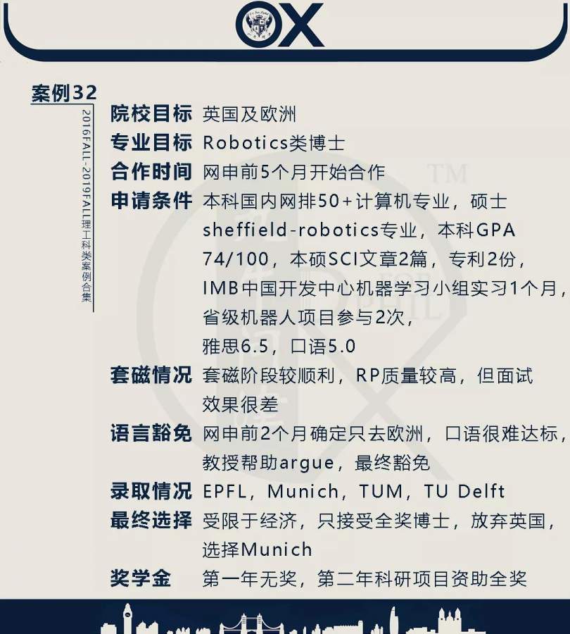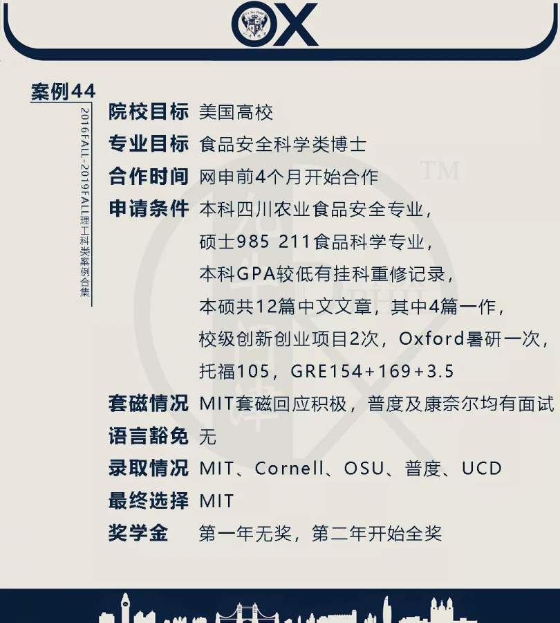 【郑重申明】 1、文中为截止2019FALL对应专业部分优秀录取案例,更多案例正在整理中,将持续更新; 2、文中所有案例为经过团队真实学员允许后采集、编辑、整理而来;应部分学员要求,重要信息部分已删除; 3、文中所有案例版权归九牛问津团队所有,未经允许,严禁任何形式转载或者盗用,违者必究。 申明: 1、本系列所有文章皆为100%原创 2、首发于知乎专栏《牛津公派博士小课堂》及公众号【九牛问津】 3、我已加入“维权骑士”的版权保护计划。未经允许,严禁任何形式转载或者盗用,违者必究。 4、希望各位准备留学的学弟学妹可以作为自身硬件定位的参考 |