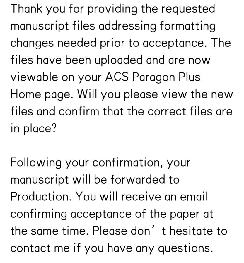 投到langmuir已经到接收前的确认了,但是这个邮件说的是怎么确认啊?去网站上也没有,是不是回复一下邮件,就说确认可以上传就完了啊? s90802-094303(1).jpg s90802-094759(1).jpg |