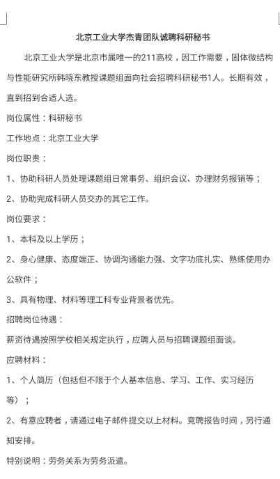 北京工业大学杰青团队诚聘科研秘书 北京工业大学是北京市属唯一的211高校,因工作需要,固体微结构与性能研究所韩晓东教授课题组面向社会招聘科研秘书1人。长期有效,直到招到合适人选。 岗位属性:科研秘书 工作地点:北京工业大学 岗位职责: 1、协助科研人员处理课题组日常事务、组织会议、办理财务报销等; 2、协助完成科研人员交办的其它工作。 岗位要求: 1、本科及以上学历; 2、身心健康、态度端正、协调沟通能力强、文字功底扎实、熟练使用办公软件; 3、具有物理、材料等理工科专业背景者优先。 招聘岗位待遇: 薪资待遇按照学校相关规定执行,应聘人员与招聘课题组面谈。 应聘材料: 1、个人简历(包括但不限于个人基本信息、学习、工作、实习经历等); 2、有意应聘者,请通过电子邮件提交以上材料。竞聘报告时间,另行通知安排。 特别说明:劳务关系为劳务派遣。 联系人:王老师;E-mail:wlh@bjut.edu.cn 发自小木虫Android客户端 |