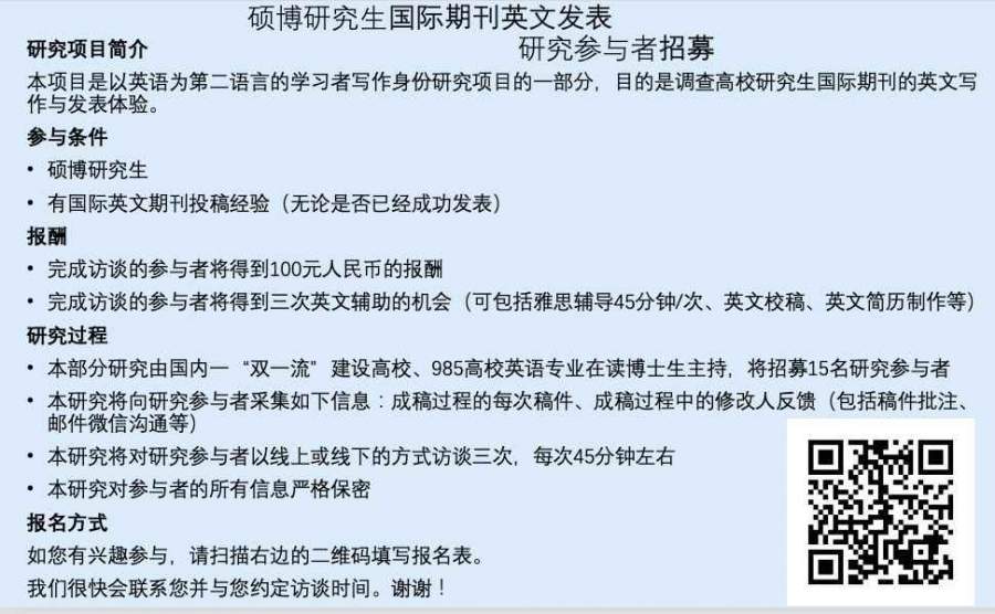 硕博研究生国际期刊英文发表研究项目参与者招募