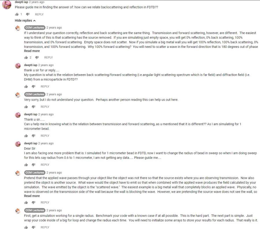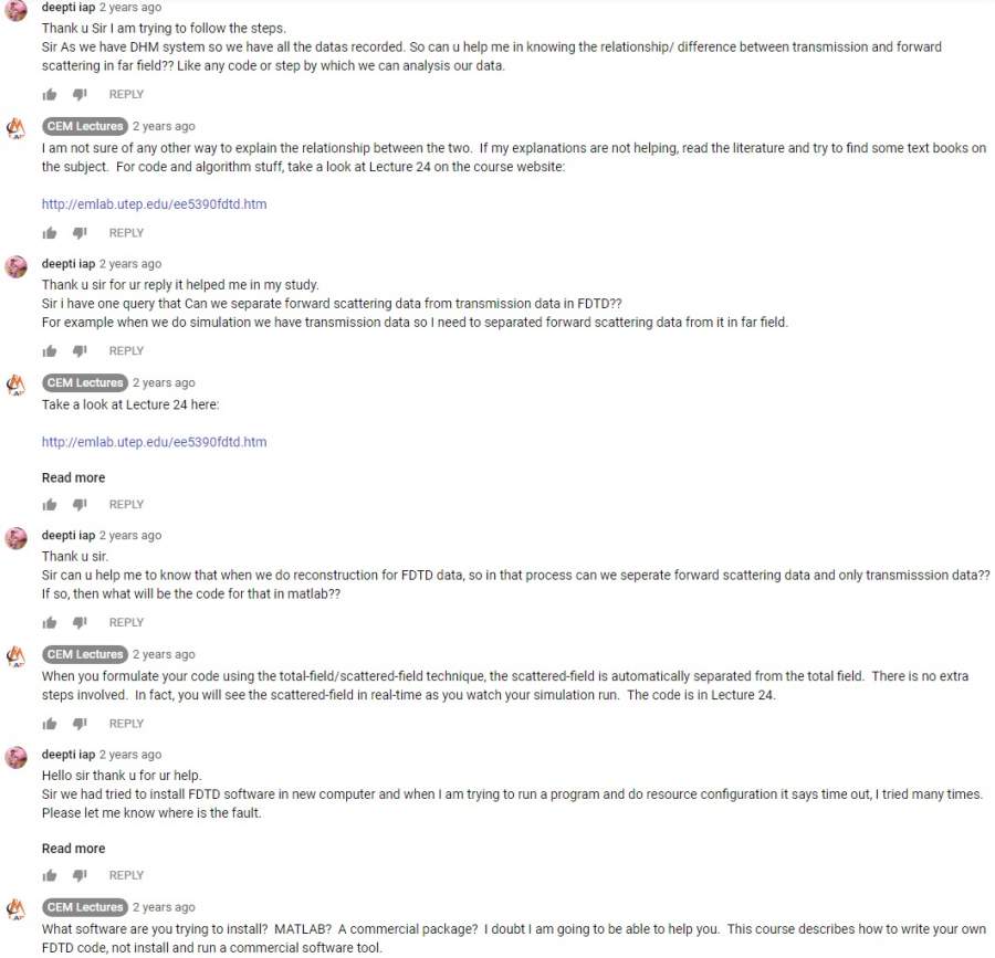Q: 在哪个网站上找的 ? A: YouTube, 下载方法登在 https://muchong.com/bbs/viewthread.php?tid=13346831&pid=4&target=1#pid4 另附有关量子光学 FDTD 的 (Matlab ?) 动画: https://www.youtube.com/watch?v= ... ndex=4&t=0s YouTube 就学习而言是金山, 不方便看的话我可把 UTEP 州立大学 Rumpf 教授的 FDTD 视频转存到百度云盘分享 PS: Rumpf 教授英语发音标准, 回信甚勤, lz 你的物理天赋出众, 小心行事, 很可能被保送到 Rumpf 教授的实验室用 Matlab 研究前沿工艺 (看视频) Grace Kelly 成摩納哥王妃, Ramanujan 成数学家 Thomas Hardy 的留学生, 均经好信促成 Rumpf 教授个性开放[1], 发言坦诚[2], 教材精闢[3], 如果得到真传, lz 你日后的教学视频肯定入围全国精品 [1] 学生口试成功消息: https://emlab.utep.edu/ 联系学生: https://emlab.utep.edu/team.htm [2] https://emlab.utep.edu/resources.htm + YouTube 线上会话 [3] https://emlab.utep.edu/academics.htm PPS: Matlab 网上教材: https://qa.1r1g.com/sf/ask/1870244281/ https://web.mit.edu/8.13/matlab/ ... t3_Animation.html#6 ( 请不要删除帖 ) ------- YouTube 线上会话 -1.jpg YouTube 线上会话 -2.jpg |