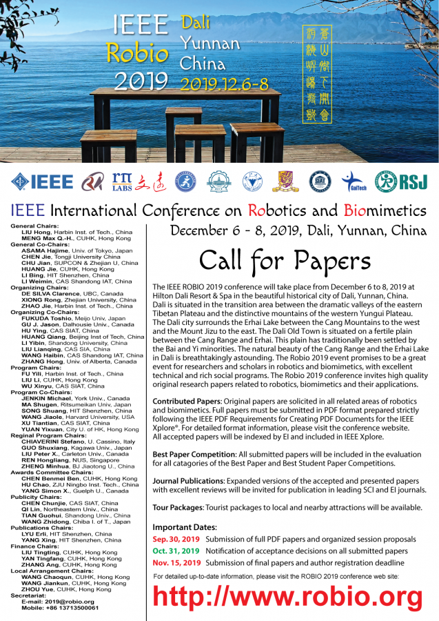Dear Colleagues and Friends, Sponsored by the IEEE RAS and the Rπ Labs, the IEEE Robio 2019 (The 2019 IEEE International Conference onRobotics and Biomimetics) conference will take place in the beautiful historical city of Dali, Yunnan Province, China from December 6 to 8, 2019: https://www.robio.org Dali is famous for its natural beauty and its diversity in culture and people. The natural beauty of Erhai Lake and Cang Mountain in Dali are breathtakingly astounding. The Robio 2019 conference promises to offer the participants a great experience with excellent technical and social programs. High quality papers reporting original research results and innovations in all aspects of robotics, biomimetics, automation, artificial intelligence, computer vision, image processing, sensors, and all related areas as well as their applications are invited. Contributed Papers: Papers are solicited in all areas mentioned above. All papers must follow the IEEE Xplore® PDF format for IEEE Xplore database and EI index. Organized Sessions: Proposals for organized sessions focused on new and innovative topics and applications are welcome for submission via the conference secretariat. Best Paper Competition: All the submitted papers will be automatically considered and evaluated for the following best paper competitions: - Best Conference Paper Award - Best Student Paper Award - T.J. Tarn Best Paper in Robotics Award - Best Paper in Biomimetics Award - Rπ Labs Best Paper in AI in Robotics Award Important Dates: Sep. 30, 2019: Submission of full PDF papers & OS proposals Oct. 31, 2019: Notification of paper acceptance decisions Nov. 15, 2019: Submission of final papers and author registration We have great technical and social programs for you and look forward to your contributions and seeing you @ Robio 2019 in Dali in December! Sincerely, Robio 2019 Organizers 2019@robio.org Robio2019CFP.png |