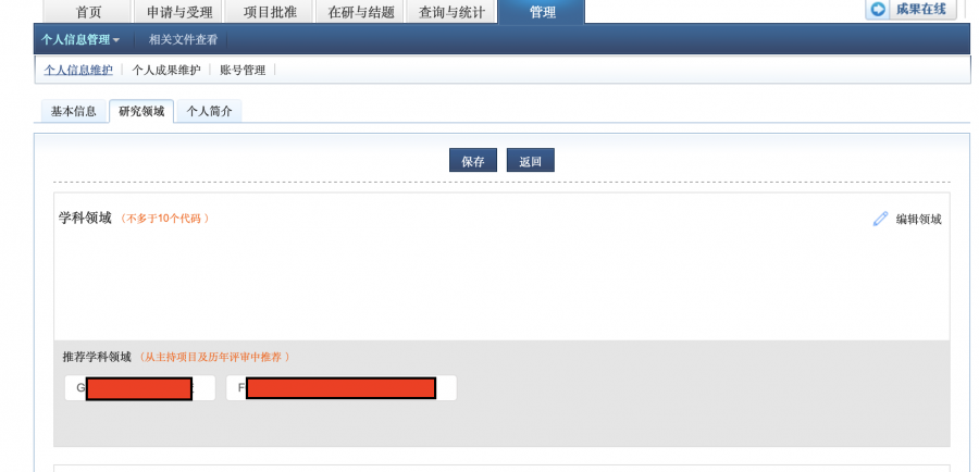 管理-个人信息维护-研究领域-推荐的学科领域中出现 当年申请的代码,什么意思?推荐的关键词中出现本子的关键词,什么意思?大家都是如此吗?![]() ![]() ![]() ![]() |