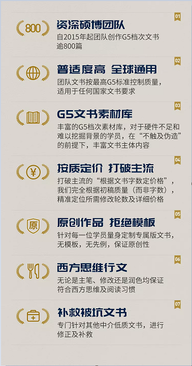 提示:文章皆为原创, 我已加入“维权骑士”的版权保护计划,版权所有,未经作者允许禁止转载,违者必究。 九牛问津团队由真实g5及港三大硕博组成的团队,以“高质量,正三观,做清流”为核心理念,致力于提供尖端硕博士留学申请服务,旨在净化留学环境,革新力学产业。 一、文书指导服务 九牛问津文书指导服务,为牛剑硕博主笔,只做原创定制,七大特色,助力文书指导。 历年文书撰写战绩: 文书主要分布: 文书案例展示: 二、文书修改解析详解(点击以下标题链接获取) 1、【原创】实例讲解理工类文书 2、【原创】cs类文书写错的那些典型误区 3、【原创】留学文书sop/ps中难以自知的中式思维 4、【原创】申请文书sop中的minuses 5、【原创】为什么申请文书需要半diy 6、【原创】九牛问津团队留学文书修改解析 三、联系方式 1、小木虫商家信息:九牛问津团队 2、九牛问津前段咨询微信:dy_941105 3、公众号:九牛问津 [ Last edited by freedomzzr on 2020-8-18 at 14:54 ] |