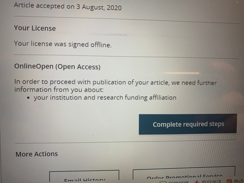 你好,我也遇到这个问题不太明白,但是收到了这封邮件:需要我Confirm your affiliations and research funders for this article.然后按照他给的链接点进去看是这样的,还是有关开源的,目前不清楚是否要点击这个 发自小木虫IOS客户端 |