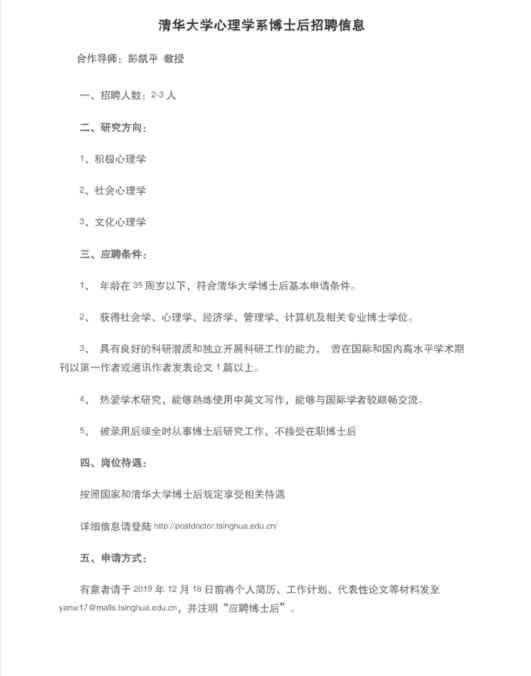合作导师:彭凯平 教授 一、招聘人数:2-3人 二、研究方向: 1、积极心理学 2、社会心理学 3、文化心理学 三、应聘条件: 1、 年龄在35周岁以下,符合清华大学博士后基本申请条件。 2、 获得社会学、心理学、经济学、管理学、计算机及相关专业博士学位。 3、 具有良好的科研潜质和独立开展科研工作的能力, 曾在国际和国内高水平学术期刊以第一作者或通讯作者发表论文1篇以上。 4、 热爱学术研究,能够熟练使用中英文写作,能够与国际学者较顺畅交流。 5、 被录用后须全时从事博士后研究工作,不接受在职博士后 四、岗位待遇: 按照国家和清华大学博士后规定享受相关待遇 五、申请方式: 有意者请于2019年12月18日前将个人简历、工作计划、代表性论文等材料发至yanw17@mails.tsinghua.edu.cn,并注明“应聘博士后”。 发自小木虫Android客户端 |