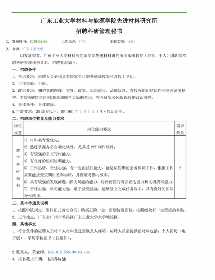 科研管理秘书招聘-广东工业大学材料与能源学院先进材料研究所闵永刚教授团队