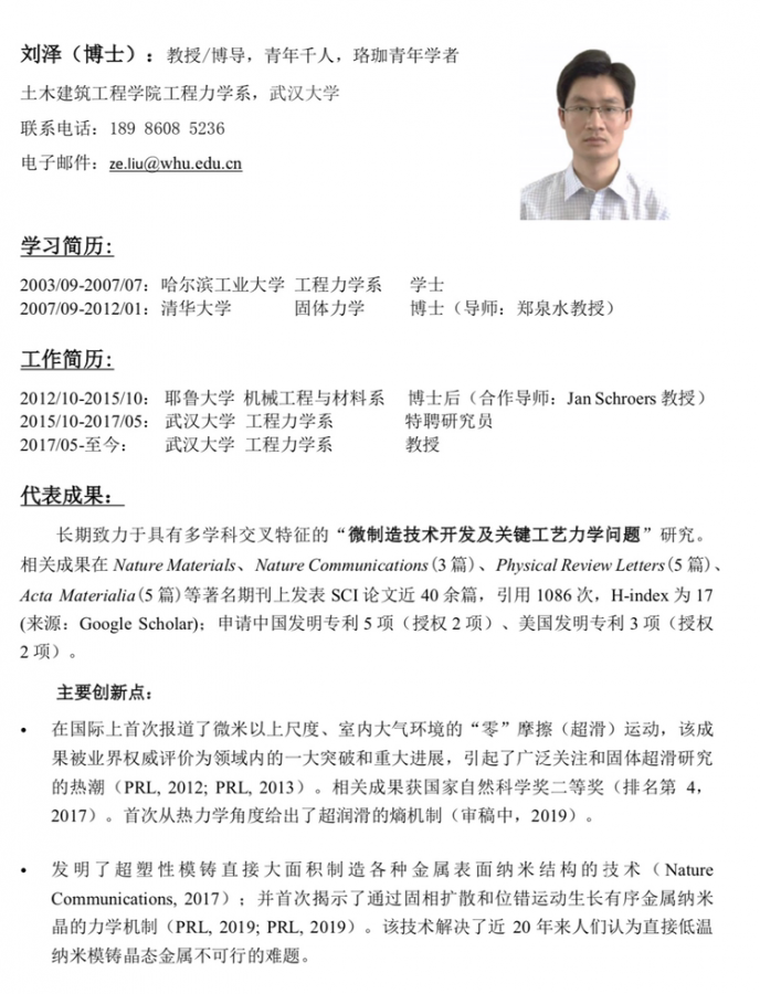武汉大学力学系刘泽招收推免硕士生