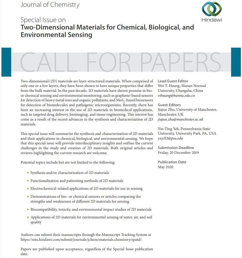 本人作为客座编辑(lead guest editor),现征集特刊稿件。具体信息如下: SCI期刊:Journal of Chemistry (IF:1.727,CiteScore:1.32) 征稿主题:Two-Dimensional Materials for Chemical, Biological, and Environmental Sensing 详细网址:https://www.hindawi.com/journals/jchem/si/384605/cfp/ 欢迎材料学、化学、生物学、环境科学相关方向的投稿! 欢迎留言咨询! Call for paper-384605.jpg |