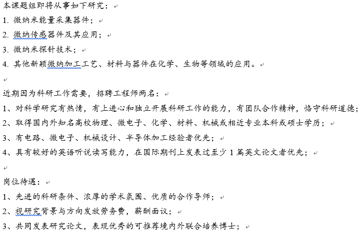 课题组负责人汪飞老师,南方科技大学(国家示范性)深港微电子学院长聘副教授(正研究员),博士生导师。曾任丹麦科技大学助理教授。2013年以深圳市孔雀计划引进南方科技大学担任副教授。入选广东省特支计划,担任深圳市重点实验室副主任,中国微米纳米技术学会微纳执行器与微系统分会理事。作为负责人主持丹麦FTP项目(科技产业基金委,类似863)、国家自然科学基金、广东省自然科学基金(杰出青年项目)及深圳市研究课题共12项,企业横向课题2项,累计科研经费约2000万元。2016年被推选为微纳传感器领域顶级国际会议Transducers 2017程序委员会委员(Transducers 2019连任),2019年获得IEEE MEMS 2020会议邀请报告(全球8名,大陆唯一)。近年来研究重点围绕微纳能量收集技术及用于环境监测的自供能传感器等。已出版英文专著3章节,累计发表学术论文140余篇,其中SCI期刊论文68篇(2篇封面,1篇能量收集工作评为ESI高被引论文),包括Applied Energy、IEEE EDL、Sensor and Actuators A&B、J.MEMS、JMM等领域一流期刊。以第一发明人获批1项国际发明专利(已经转让给丹麦Capres公司,实现产业化)、6项中国发明专利。2018年获得深圳市青年科技奖。 本课题组介绍链接:https://eee.sustc.edu.cn/p/wangfei/index.html 应聘流程: 1. 申请人将详细的申请材料发送到招聘专用邮箱:wangfeiustc@gmail.com,邮件标题请注明“姓名+学历+应聘职位”。申请材料需包括:(1) 详细的个人简历,含学习、工作和科研的经历,主要科研成果(如论文论著、成果证书或奖励)清单以及联系方式;(2) 2-3推荐人的姓名及有效联系方式;(3) 其他可以证明工作能力的材料。 2. 通过简历初步遴选者,将在一周内获得电话面试或视频面试通知。 3. 通过电话面试者将被邀请到南科大现场面试(报销路费),通过现场面试者将依照相关程序尽快办理入职手续。 招聘实验员.png [ 来自版块群 广东 ] |
