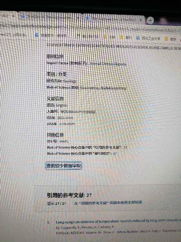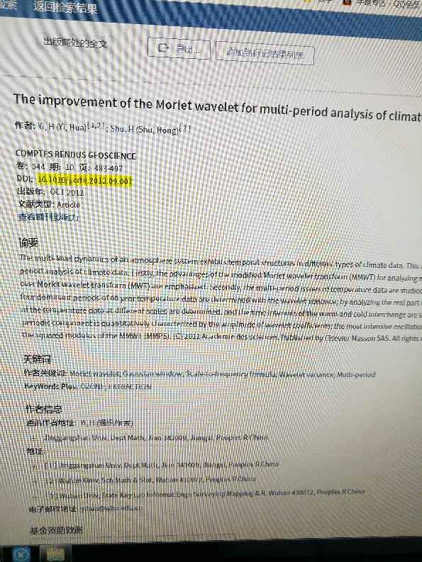 求助,哪位能进web of science的,帮我查一篇文章的sci被引用的次数。谢谢! 文章信息如下:H. Yi, and H. Shu, “The improvement of the Morlet wavelet for multi-period analysis of climate data,” Comptes rendus - Géoscience, vol. 344, no. 10, pp. 483-497, 2012. |