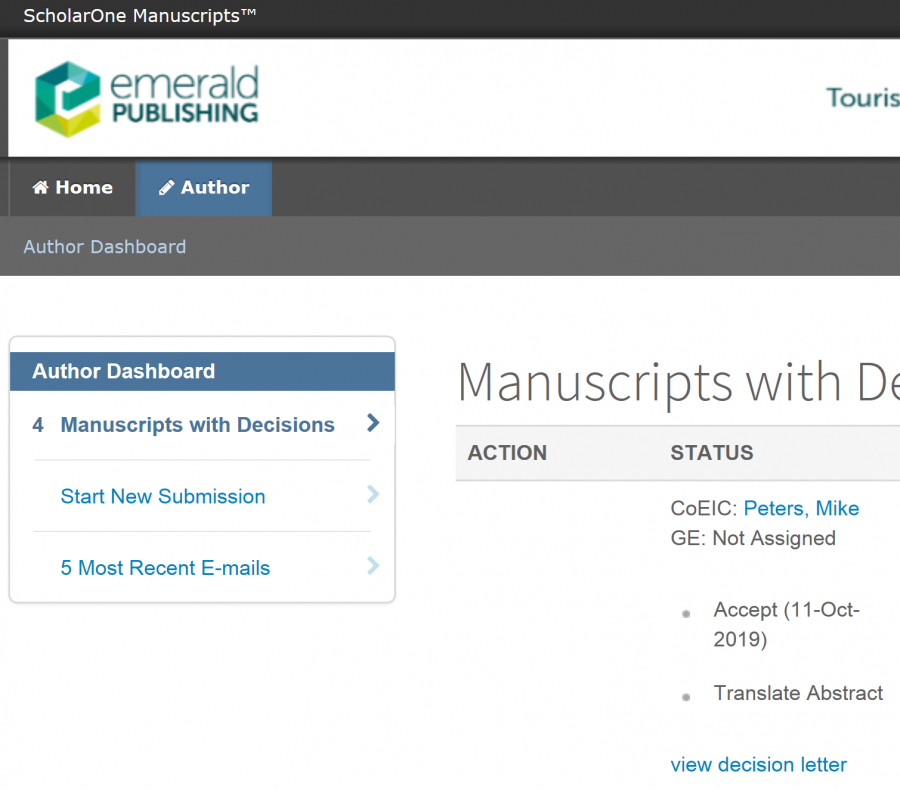 最近emerald旗下某论文已经被接收,对方来信要求填写Copyright Transfer Agreement(t is a pleasure to accept you're manuscript***, entitled "***" in it's current form for publication in Tourism Review. Please note, no further changes can be made to your manuscript. Please go to you're Author Centre at https://mc.manuscriptcentral.com/tr (Manuscripts with Decisions for the submitting author or Manuscripts I have co-authored for all listed co-authors) to complete the Copyright Transfer Agreement form (CTA). We cannot publish your paper without this.All authors are requested to complete the form and to input there full contact details. If any of the contact information is incorrect you can update it by clicking on your name at the top right of the screen. Please note that this must be done prior to you submitting your CTA.)可是操作台里是空的,有没有那个大神发过emerald旗下期刊论文,第一次发它旗下的有点懵。(要求的翻译已经完成,给编辑发了邮件,没有回复) 微信截图_20191021163245.png |