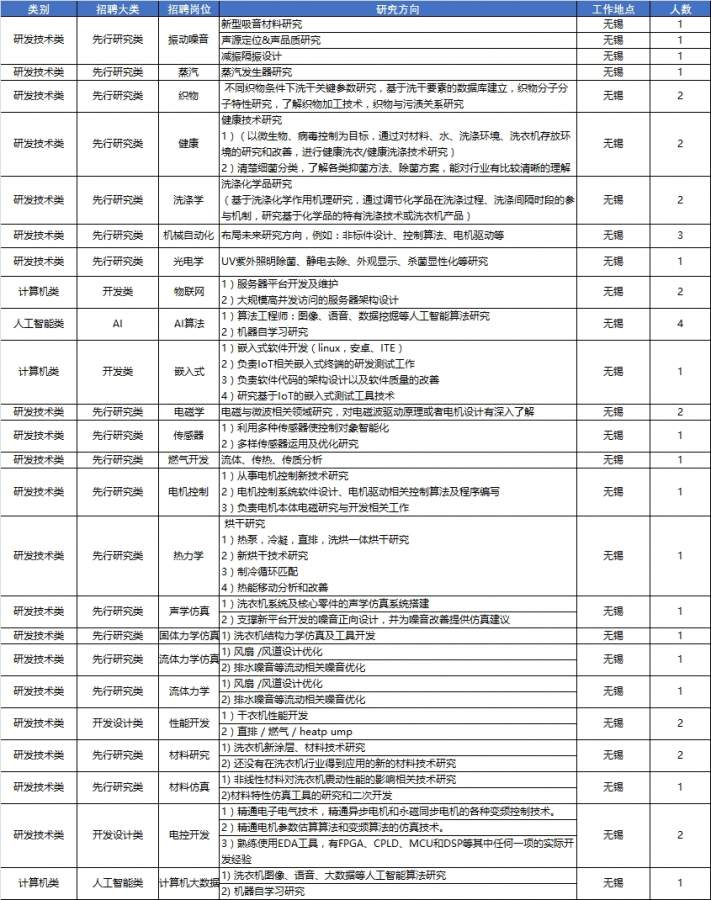美的洗衣机事业部行政总部位于江苏省无锡市,目前拥有无锡、合肥、南海、泰国等几大全球少数能生产滚筒、波轮大型工业洗衣机的生产基地,总占地面积逾1200亩,总装年产能达1450万台,并向工业洗衣机、控制器、电机等产品延伸,能够向市场提供较为丰富的洗衣机产品。 美的洗衣机事业部拥有国家认定的企业技术中心和国家认可实验室,依靠技术战略联盟,坚持自主创新,拥有国际领先的变频技术,智能驱动控制,结构设计及工业设计等洗涤核心技术。并以严谨的态度、苛求细节的专业精神,苛求洁净的最高标准,保证每一台洗衣机的完美品质。公司拥有洗衣机专利460项,自主软件著作权200项,以卓越品质赢得全球3800万用户的喜爱。 具体招聘岗位见下图,有意向请将简历发送至邮箱lanping.tang@midea.com 博士招聘需求1021图片.jpg |