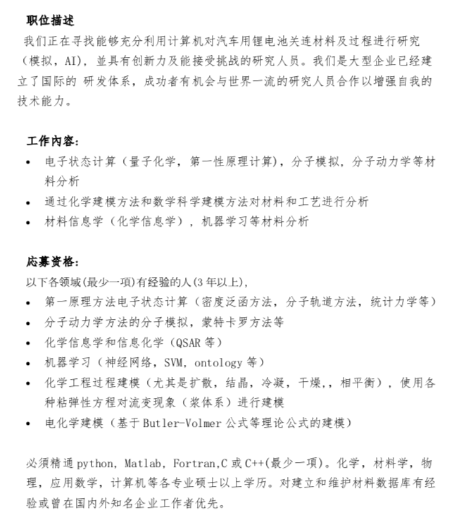招聘电池材料仿真(各方面)研究人员
