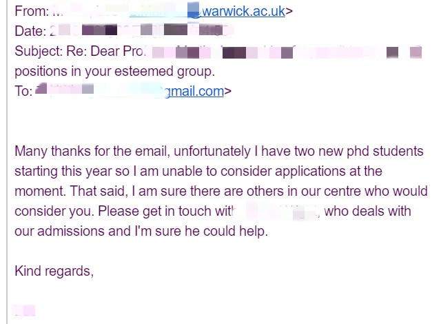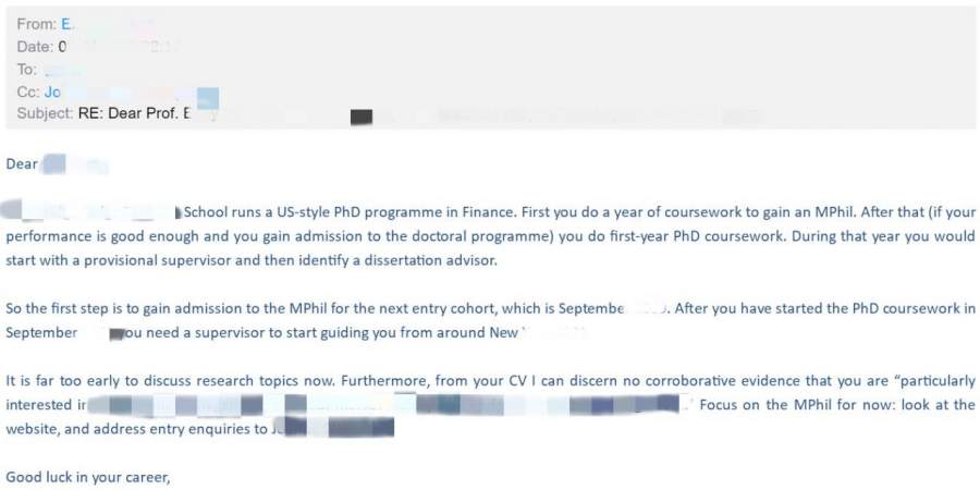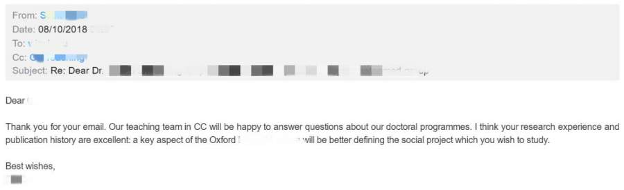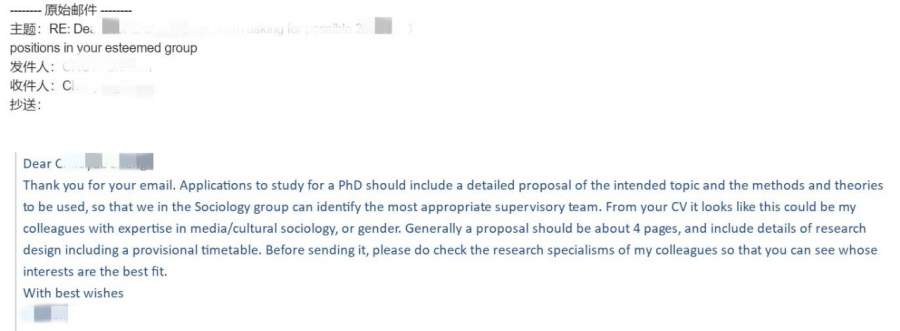 提示:文章皆为原创, 我已加入“维权骑士”的版权保护计划,版权归九牛问津团队所有,未经作者允许禁止转载,违者必究。 团队创立至今,指导套磁教授成功250余例,失败30余例。本系列案例将列举出各式各样套磁过程中,被套磁对象(教授)回复的内容,有些让人灰心丧气,有些让人热血沸腾,有些让人摸不着头脑愣在原地。首先简单普及以下内容: q1:套磁适用人群 ? a1: 申请博士、研究型硕士。 q2:套磁适用国家 ? a2: 普遍适用,效果最佳为英、欧、港、新、澳。 q3:套磁失败=申请失败 ? a3: 否。套磁成功可极大增加录取几率,但套磁失败完全不影响正常网申。每年套磁失败或无套磁直接网申的案例也是相当多。 q4:套磁可能会达到哪些效果 ?(得到教授哪些帮助 ?) a4: 申请关键信息获取、帮助修改rp、获得面试或见面机会、课题组实习机会、口头offer、语言豁免、直接录取、奖学金获得等等。 更多套磁相关信息请见:留学申请致命误区。因此,套磁对象的选择,合理、正确的套磁规划,交流方式,深入跟进方式等在套磁过程中极为重要。 注意:文中涉及文书材料已获得所有者授权使用,并根据所有者要求,去除部分隐私性内容。 案例展示 case 1: 17fall,社会学博士申请,7月套磁,优质回复,属于课题比较match,对方也对套磁者背景感兴趣的情况。后续沟通教授帮助修改research proposal多轮,学员最终选择了其他课题组,但使用了此篇rp。 图片来源:17fall某学员 case 2: 19fall,cs博士申请,10月套磁,中偏优回复,表示对学员background极大的兴趣。后续沟通教授安排了2v1面试,11月二面,网申后直接录取。 图片来源:19fall某学员 case 3: 18fall,cs类博士申请,7月套磁,优质回复,教授要求根据两篇文章写一个summary,可以理解写一个小的essay或research proposal draft,表明教授对你的研究背景很感兴趣,但不知道你是否有相应的课题研究潜力,因此需要考察。同时注意,教授明确表达可以最终帮助审阅application,说明他/她对于最终录取有一定决定权。后续沟通教授对summary不满意,但网申成功拿到offer,分配到其他课题组。 图片来源:18fall某学员 case 4: 18fall,经济类博士申请,8月套磁,询问性回复,教授明确表态“想要跟我谈,得看你有没有money”。其实这种回复并不少见,特别是英国,教授是不可能提供funding让你读博的,因此对于有scholarship在手或可以self-funded的会有一定优势,当然如何跟教授表达清楚,也是非常关键的。后续沟通教授最终帮助申请csc合作项目。 图片来源:18fall某学员 case 5: 19fall,金融类博士申请,8月套磁,中立回复,教授回复内容较长较多,总结就是:“你的简历我看不出任何你读phd的潜质,你还是去先集中精力申请个mphil吧”。本质上来说是非常好的建议。套磁阶段很适合判断选择直接phd还是先mphil/mres再phd。然而如果没有正确沟通方式打动教授,一般是不会给到此类“苦口婆心”的建议。后续无更多沟通,最终申请mphil拿到offer。 图片来源:19fall某学员 case 6: 17fall,法律类博士申请,12月套磁,直接拒绝,这就是我们常强调的“早准备,早投递,早录取”。套磁也是同样,团队每年最早一批套磁都安排在6-8月,之后效果逐步降低。如此邮件中,教授明确表示已经招收2个phd candidate,没有capacity。后续无更多沟通,转套其他教授。 图片来源:17fall某学员 有更多问题可以联系我们【九牛问津】团队小伙伴咨询咯!联系方式: 1、九牛问津前端咨询微信:dy_941105 2、公众号:九牛问津 更多留学精品音频可在喜马拉雅平台:牛津学长说留学 中收听哦~ [ Last edited by freedomzzr on 2019-11-22 at 14:09 ] |