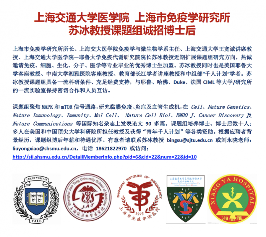 上海市免疫学研究所所长、上海交大医学院免疫学与微生物学系主任、上海交通大学王宽诚讲席教授、上海交通大学医学院―耶鲁大学免疫代谢研究院院长苏冰教授近期扩展课题组研究方向,热诚邀请免疫、细胞、生化、分子、医学等专业毕业的优秀博士生加盟。苏冰教授同时也是美国耶鲁大学客座教授、中南大学湘雅医院客座教授、国家高层次人才计划专家。苏冰教授课题组具备一流科研条件、充足经费支持,与耶鲁、哈佛、Duke、法国CIML等大学/研究所的一流实验室保持密切合作和人员互访。 课题组聚焦MAPK和mTOR信号通路,研究黏膜免疫、炎症及血管生成机制,在 Cell、 Nature Genetics、Nature Immunology、Immunity、Mol Cell、 Nature Cell Biol、EMBO J、Cancer Discovery 及 Nature Communications 等国际知名杂志上发表论文 90 多篇。课题组培养博士、博士后数十人;多人在美国和中国顶尖大学科研院所担任教授及获得“国家高层次人才计划青年项目”等各类资助。根据应聘者背景经历,课题组博后年薪和待遇优厚。有意者请联系苏冰教授bingsu@sjtu.edu.cn 或刘永晓老师:liuyongxiao@shsmu.edu.cn,电话 18621822970 或访问: https://sii.shsmu.edu.cn/DetailM ... um=22&id=10 PastedGraphic-1.png |