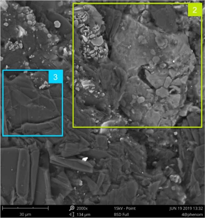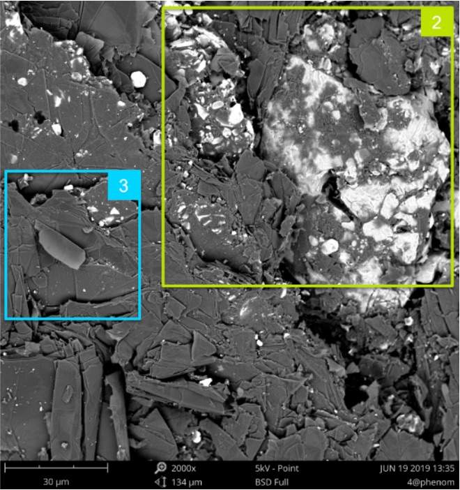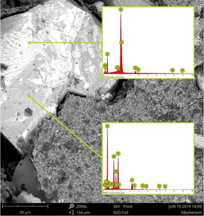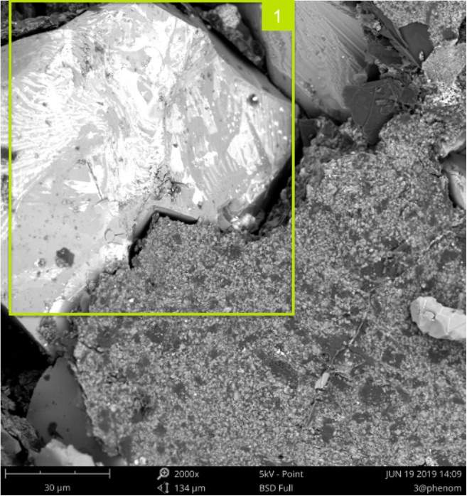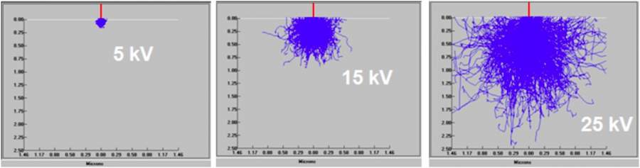 扫描电子显微镜(SEM)是依靠电子束与样品相互作用产生俄歇电子、特征 X 射线和连续谱 X 射线、背散射电子等信号,对样品进行分析研究。 扫描电镜在表征样品时,受诸多参数的影响,不同类型样品应选用合适的参数,才能呈现出样品更真实的表面信息。如在不同的加速电压下,电子束与样品作用所获得的信号会有很大的差别。从理论上说,入射电子在样品中的散射轨迹可用 Monte Carlo 的方法模拟(如图 1 所示),并且推导得到入射电子最大穿透深度 Zmax, Zmax=0.0019(A / Z)^1.63E0^1.71/ρ 图1 电子在钛(Ti)金属中的运动轨迹 随着加速电压的增加,入射电子激发深度越深,探头接受的信号包含大量材料内部的信息。 2000x@15kV (BSD) 2000x@5kV (BSD) 2000x@15kV (BSD) 2000x@5kV (BSD) 图2 对比图 2 背散射电镜(BSD)图片可以看出同一样品位置在不同加速电压下,样品表面成分衬度、形貌发生了明显的变化。 1、2 区域在 5kv 成像时,样品表面有白色衬度相,在 15kv 成像时表面主要为灰色衬度相+少量白色衬度像。 对此样品 1 区域成分分析结果如图 3 所示,白色衬度相主要由 Zr 组成,灰色衬度相主要由 O、Si、Mg、Al 组成。 由此看以看出,15kv 成像时,高能电子束穿透了表面含 Zr 层,呈现出了下部的主要由 O、Si、Mg、Al 组成相。在 5kv 成像时,电子束未穿透表面含 Zr 层,呈现出更接近于真实的样品表面的成分衬度相。 3 区域在 5kv 下表面细节清晰有立体感,15kv 下由于电子穿透深,表面细节丢失且无立体感。因此对于此类样品,低电压下对于表面形貌的呈现更真实。 图3 在使用扫描电镜时,可以尝试不同的加速电压、真空度等参数,你会发现随着参数的调节,样品表面形貌会发生(微小或者巨大)变化,找到适合自己样品的参数,才能拍摄出“更真实”的 SEM 图片。 |