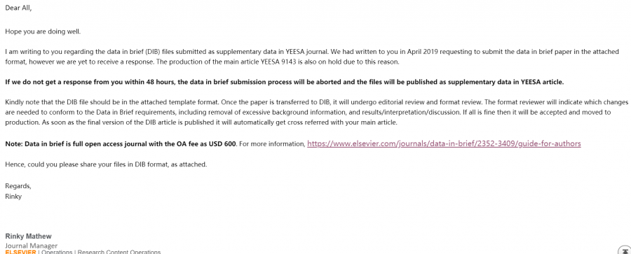 事情是这样,今年年初被爱思唯尔旗下某期刊接收SCI一篇,不久后要求提供data in brief 并花费600USD,落款是爱思唯尔某个经理。我一看不是编辑部,还要花钱,就觉得应该是爱思唯尔的赚钱副业,就没管。然而8个月过去了,被接收的文章始终无法在谷歌学术上搜到,于是今天给编辑部发了邮件,收到的回复依然是某个经理,他依然要我上传DIB,并花费600美元,不然无法出版文章,如下图: