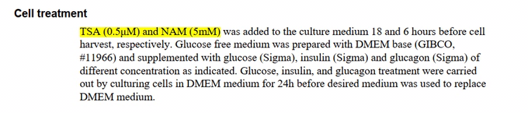 1.是作者把0.5uM TSA和5mM NAM加入细胞培养液,但是没有说明加入了多少体积;2.还是TSA和NAM最终在细胞培养液的浓度分别是0.5uM和5mM。 发自小木虫IOS客户端 |