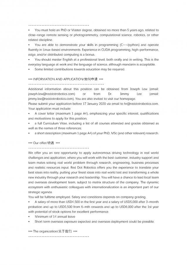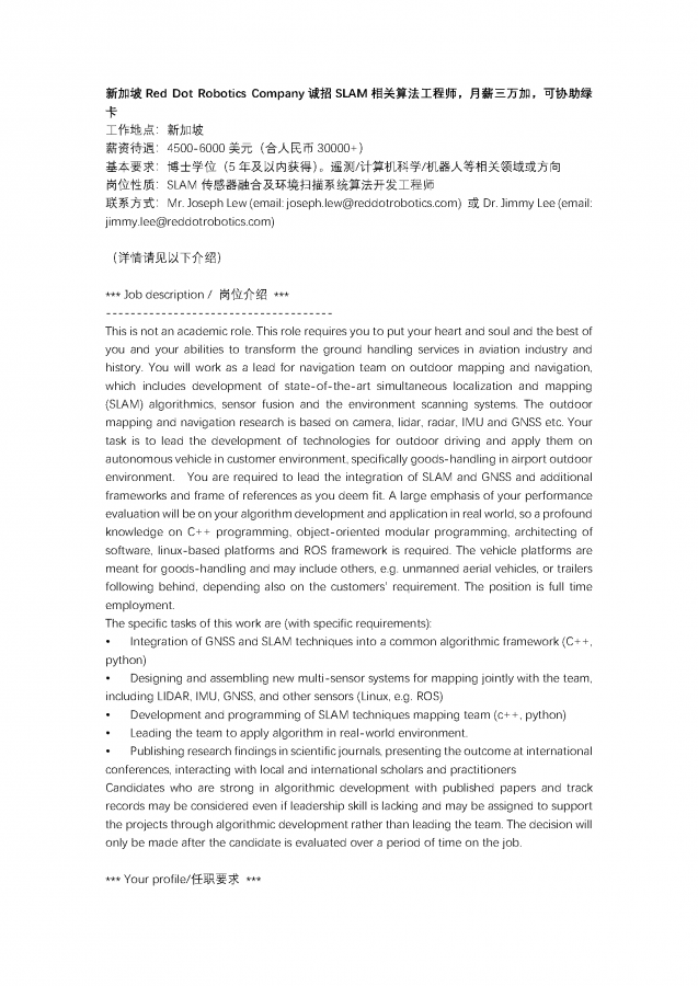 新加坡Red Dot Robotics Company诚招SLAM相关算法工程师,月薪三万加,可协助绿卡 工作地点:新加坡 薪资待遇:4500-6000美元(合人民币30000+) 基本要求:博士学位(5年及以内获得)。遥测/计算机科学/机器人等相关领域或方向 岗位性质:SLAM传感器融合及环境扫描系统算法开发工程师 联系方式:Mr. Joseph Lew (email: joseph.lew@reddotrobotics.com) 或Dr. Jimmy Lee (email: jimmy.lee@reddotrobotics.com) (详情请见附件介绍) job_页面_1.png job_页面_2.png job_页面_3.png |