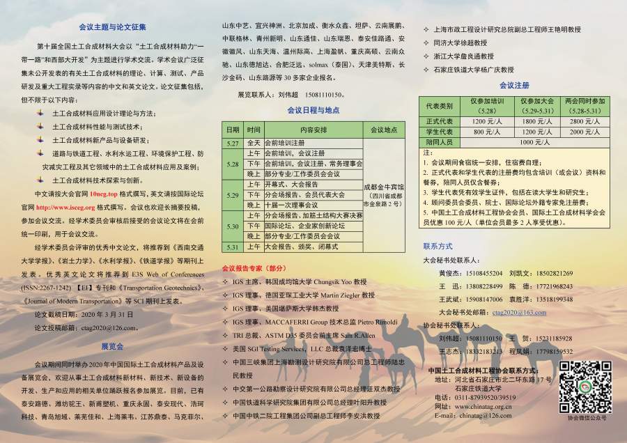 《第十届全国土工合成材料大会 暨2020年中国国际土工合成材料产品及设备展览会 (第二号通知)》( 10th National Conference on Geosynthetics&2020 Chinese Exhibition on International Geosynthetics Products and Equipment<10NCG>) 会议介绍 第十届全国土工合成材料大会将于2020年5月在成都召开,欢迎从事土工合成材料产品生产与测试,工程设计与施工,科研及相关技术的专家学者、科技人员和企业家踊跃投稿并积极参加会议。本次大会将以“土工合成材料助力一带一路和西部大开发”为主题进行学术研讨交流。详见中国土工合成材料工程协会官网通知:https://www.chinatag.org.cn/tghc_html/xsjl/2020/0103/1637.html 。 第十届全国土工合成材料大会 暨2020年中国国际土工合成材料产品及设备展览会 【第二号通知】-1.jpg 第十届全国土工合成材料大会 暨2020年中国国际土工合成材料产品及设备展览会 【第二号通知】-2.jpg |