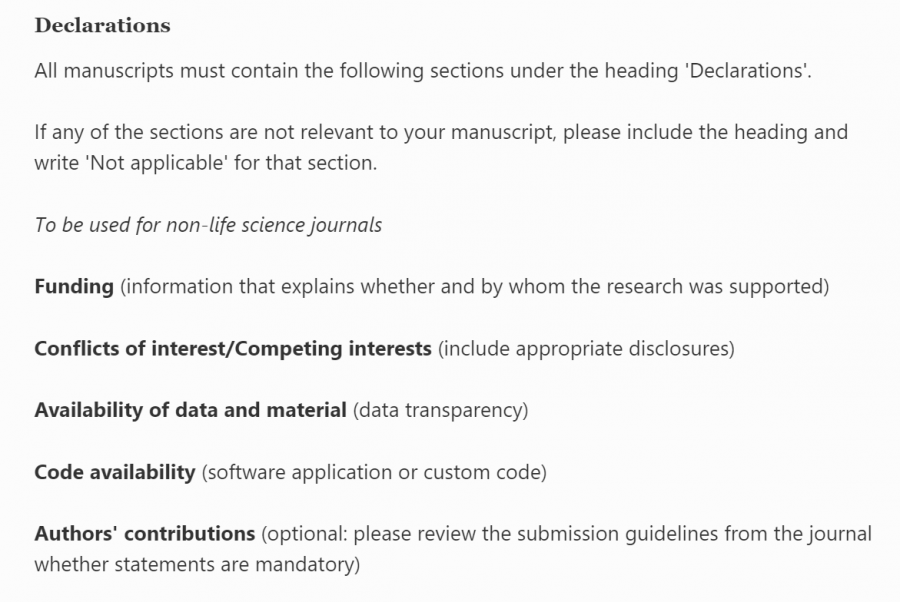 求助!想要投springer的期刊Journal of Intelligent Information Systems,遇到一些问题,望投过springer相关期刊的朋友帮忙看一下: 遇到的问题: 1、期刊投稿要求中Title page 和Text的介绍是分开的,投稿时Title page是否要单独作为一个文件提交; 2、如需单独提交,需要以什么格式提交,在系统中选择什么类型(可以将type选为manuscript吗); 3、请问title page 中要求包括Declarations,具体包括Funding 、Conflicts of interest、Availability of data and material、Code availability、Authors' contributions五部分,想问这是必须提交的部分吗。投稿指南中没有给出单独的包含Declarations的格式说明,给出的Latex模板中也没有这部分,想请问一下在Latex中是以\section{Declarations}编辑吗; 4、如果Title page单独提交,Text部分还需要包括题目、作者、摘要等信息吗? 5、哪位朋友有Declarations相关的模板,如能提供将非常感谢。 期刊投稿指南: https://www.springer.com/journal ... _After%20acceptance 急求,在此先谢谢各位!!!!!! 声明.PNG |