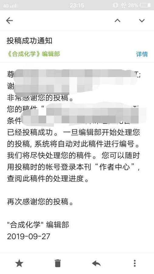 请问大家有没有投过《合成化学》啊。我这样算投稿成功了吗,为什么我查阅合成化学期刊里没有我这个论文呢??? 发自小木虫Android客户端 |