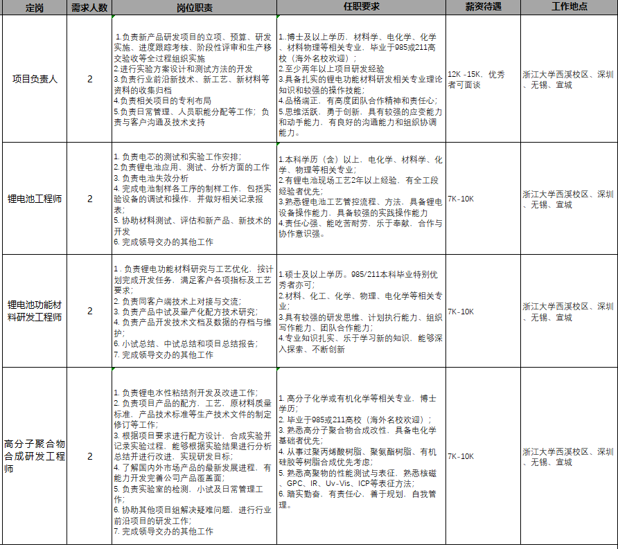 组建杭州锂电水性粘结剂开发团队,岗位缺少8人,期待您的加盟:victory: