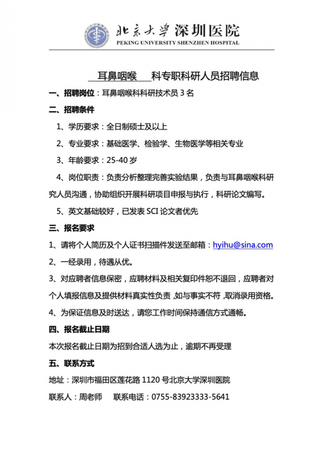 北京大学深圳医院耳鼻喉科招聘技术员