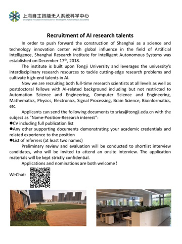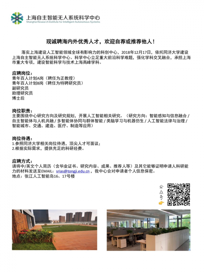 同济大学-上海自主智能无人系统科学中心招聘科研人才