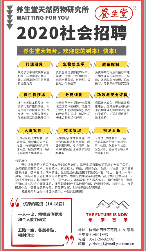 浙江养生堂天然药物研究所有限公司急聘药学研究相关领域各学科、各层次人才。欢迎药学同仁前来咨询! 微信图片_20200218160831.png [ Last edited by JINQH1982 on 2020-2-18 at 16:15 ] [ 来自版块群 浙江 ] |