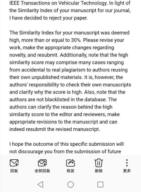昨天新投了一篇transactions on vehicular technology(TVT)的论文,结果今天就收到编辑的拒稿邮件,说重复率过高(30%),创新性不够,所以直接拒了。虽然楼主确实有借鉴师姐(也是投的这个期刊)的写法,但是仅限于写作思路,具体的句子内容是不同的。编辑并没有给出楼主重复在哪里,所以不知道如何修改,请问如何降低重复率?难道要重新写吗(哭了哭了),求求高手指点一二( ??? ? ??? ) 发自小木虫Android客户端 |