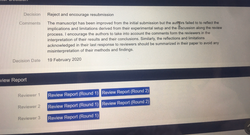 收到编辑意见,希望大家能帮忙出出主意,这篇文章已经拒过两次了。审稿人有一个意见因为时间和条件限制无法实现,再投希望大吗? Decision Reject and encourage resubmission Comments The manuscript has been improved from the initial submission but the authors failed to to reflect the implications and limitations derived from their experimental setup and the discussion along the review process. I encourage the authors to take into account the comments form the reviewers in the interpretation of their results and their conclusions. Similarly, the reflections and limitations acknowledged in their last response to reviewers should be summarized in their paper to avoid any misinterpretation of their methods and findings. 发自小木虫IOS客户端 |