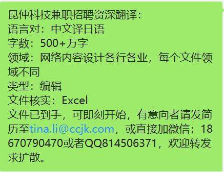 急需兼职资深译者: 语言对:中文译日语 字数:500+万字 领域:网络内容设计各行各业,每个文件领域不同 类型:编辑 文件核实:Excel 交期:2.29.2020 内容截图请查看附件 项目已经进行了5天了,并已全部完成了翻译,即刻开始编辑。交期紧急,希望各位高手出手相助!非常感谢! 11.jpg 22.jpg [ 来自版块群 广东 ] |