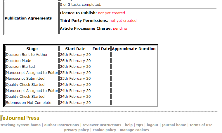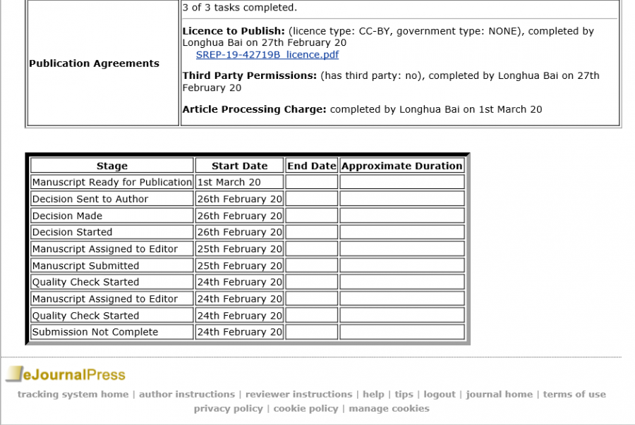 邮件内容如下:(2020年2月26日收的邮件) Dear Prof XXX, Congratulations on the acceptance of your article "High XXXXX" in Scientific Reports. Click here to visit the online publication agreements tool: Publication Agreements. You will be asked to sign the Licence to Publish agreement and to confirm that all permissions for third party materials have been provided. You can use your eJP login details to access the publications agreements tool. PLEASE NOTE: you must be logged in to the eJP account that is registered to this email address to access the online publication agreements. If you are not already logged in to your eJP account, you can do so here:https://mts-srep.nature.com/cgi-bin/main.plex?XXXXXXXXXXXXXXXZ. Please do not forward this email on to anyone else: the online publication agreements can only be accessed by one author and should be completed by you, the corresponding author. Please note that your article will not be sent to production until you have both completed the publication agreements and provided your billing information. 但点击链接进入时,在投稿系统中显示如附图的这个界面,那三个红色的地方并无链接可点开,网面中其他地方也没有能填写"publication agreements"任何链接,请问各位老师、同一战壕的兄弟姐妹,到底是什么回事?该如何处理?跪谢! 因涉及毕业,较着急。 QQ图片20200228082602.png |