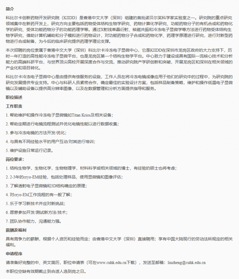 香港中文大学(深圳)诚聘【实验室工程师/高级实验室工程师】 【岗位要求】 •结构生物学,生物化学,生物物理学,材料科学或相关领域的博士,有经验的硕士也将考虑 •2-3年的cryo-EM经验,包括处理样品,使用显微镜和图像评估 •了解透射电子显微镜和3D结构确定的原理 •对cryo-EM工作流程的有一般了解 •乐于学习新技术并应对新挑战 •愿意参加开发/测试新方法/技术 •团队协作能力,沟通能力强 【工作职责】 •帮助维护和操作冷冻电子显微镜如Titan Krios及相关设备 •帮助定期进行电镜流程测试并优化电镜性能以进行数据收集 •参与冷冻电镜的方法开发/优化 •与具有不同经验水平的用户互动/对其进行培训 •维护设施日常运行记录 【申请程序】 请准备好完整的中、英文简历,申请表(此网页下载)发送至邮箱:liuzheng@cuhk.edu.cn 【简介】 科比尔卡创新药物开发研究院(KIIDD)是香港中文大学(深圳)组建的首批诺贝尔奖科学家实验室之一。研究院的重点研究领域集中在新药开发上,研究方向主要包括药物受体结构生物学研究、药物计算化学研究、功能药物分子的有机合成和药物化学的研究、受体功能药物分子的功能药理学等。通过X射线单晶衍射、核磁共振和冷冻电子显微学等方法进行药物受体结构生物学研究,借助计算机辅助和分子模拟进行药物设计,对功能药物分子合成和药物化学、药理学原理进行研究,进行对新型药物进行合成制备,为今后的临床研究提供药理学理论支撑。 本次招聘的岗位隶属于香港中文大学(深圳)科比尔卡冷冻电子显微中心,它是KIIDD在深圳市龙岗区政府的大力支持下,历时一年打造的高性能冷冻电子显微平台,也是龙岗区第一个结构生物学平台。中心致力于建设成具有国际一流核心技术和分析能力的高端科研平台,与世界顶尖高校开展深度合作与交流,推动研究院产学研创新和突破,开展龙岗区和深圳在相关领域的产业化和项目转化。 科比尔卡冷冻电子显微中心是以提供有偿服务的设施为基础,由工作人员使用冷冻电镜成像,来辅助科研人员进行科学研究,为研究院的发展提供专业的支持与优良的平台。中心与科研人员紧密合作,确定最佳的实验设计方案,包括样品制备策略,维护和操作低温电子显微镜以及辅助设备以提供高分辨率图像,以及在数据管理和分析方面提供指导和服务。 ~~~~~~~~~~~~~~~~~~~~~~~~~~分界线~~~~~~~~~~~~~ 【Preferred Qualifications】 •M.S in structural biology, biophysics, biochemistry, material science or related field, Ph.D would be a plus •2-3 years of experience in cryo-EM including handling samples, using microscopes and evaluation of images •Knowledge of the principles of transmission electron microscopy and 3D structure determination •General understanding of cryo-EM workflow •Excellent communication and interpersonal skills •Motivated to learn new technologies and to take on new challenges •Willing to develop/test new methods/techniques •Excellent organizational skills and record keeping •Special consideration will be given to candidates with a record of achievement in collaborative, team-driven environments 【Responsibilities】 •Help maintain and operate cryo electron microscopes and related equipment •Regularly benchmark and optimize microscope performance for data collection •Participate in method developments/optimization for cryo-EM Interact closely with/train users with different levels of experience •Maintain record of daily operations in the facility 【Application Procedure】 Please send a full curriculum vitae and the completed Application Form (please download the template online) by email to liuzheng@cuhk.edu.cn 【Brief Introduction】 Kobilka Institute of Innovative Drug Discovery is one of the first batch of Nobel laureate labs at the University. Led by Prof. Brian K. Kobilka, the Nobel laureate in Chemistry in 2012, the Kobilka Institute of Innovative Drug Discovery (KIIDD) is a significant milestone in the University’s attempt to evolve into a world research university. KIIDD will focus on new drug development which includes drugs receptor structural biology research, computational chemistry research, the function of the drug molecules in organic synthesis and medicinal chemistry research, receptor function the function of the drug molecule pharmacology, etc. Researchers in KIIDD are going to carry out studies about the structural biology of drug receptors through lots of modern biological techniques, such as single crystal x-ray diffraction, Nuclear magnetic resonance (NMR) and electron microscopy. CAD and molecular simulations were used in the drug designs. KIIDD lay eyes on functional drug synthesis, medicinal chemistry and pharmacology, to further explore the pathways to make new drugs, as well as offering intellectual support on pharmacology for future clinical research. The Kobilka Cryo-EM center is a fee-for-service facility operated by the KIIDD at Chinese University of Hongkong(Shenzhen) as a state-of-the-art shared resource for biomedical researchers. The Cryo-EM staff members develop and provide their knowledge and expertise to the research community at KIIDD in applying cryo-EM imaging to their research. They work closely with investigators to define optimal experimental design including strategies for preparation of samples, maintain and operate cryo-electron microscopes and ancillary equipment in order to provide high resolution images, and provide guidance and service in data management and analysis. The successful candidate will assist facility staff with maintenance and operation of the advanced instrumentation housed in the Cryo-EM core and will work with and train us