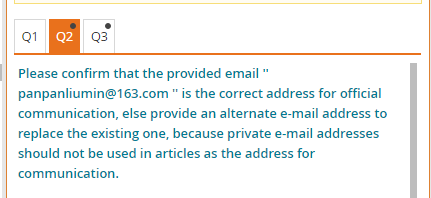 7个月的投稿加修改,等来了,接收校稿,校稿中的两个小问题急需大神帮忙支招。这俩问题该如何回复呀? 第一个:Please confirm that the provided email '' ××@163.com '' is the correct address for official communication, else provide an alternate e-mail address to replace the existing one, because private e-mail addresses should not be used in articles as the address for communication. 第二个:Please check funding information and confirm its correctness. 发自小木虫IOS客户端 |