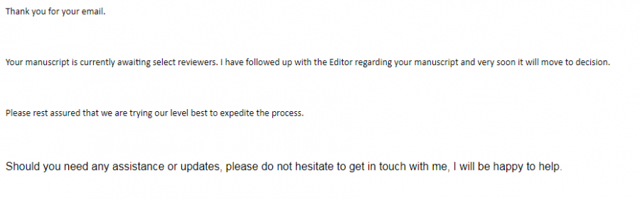 稿件外审5个月了,都说催稿容易被拒,今天鼓起勇气给编辑写信,编辑回复“Your manuscript is currently awaiting select reviewers. I have followed up with the Editor regarding your manuscript and very soon it will move to decision.”,求各位大神帮看看,是什么意思?机械搞工程,写论文不容易,求分析。