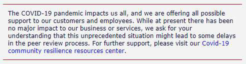 看来疫情对审稿流程确实存在一定的影响。 ############################ The COVID-19 pandemic impacts us all, and we are offering all possible support to our customers and employees. While at present there has been no major impact to our business or services, we ask for your understanding that this unprecedented situation might lead to some delays in the peer review process. For further support, please visit our Covid-19 community resilience resources center. ############################ 发自小木虫IOS客户端 |