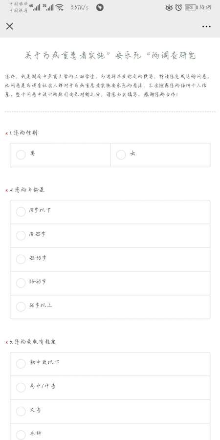 毕业论文的问卷调查,还差一些样本,请求各位帮帮忙[不要只领金币不帮忙 问卷的调查内容是社会人群对于为病重患者实施euthanasia(an 乐 si)的看法,此问卷不会泄露您的任何个人信息, 问卷设计的题目无关对错,请您放心如实填写 https://www.wjx.cn/m/52807439.aspx 微信图片_20200326144957.jpgsample text [ last edited by nigu19023 on 2020-3-26 at 19:45 ] [ last edited by nigu19023 on 2020-3-26 at 19:46 ] [ last edited by nigu19023 on 2020-3-26 at 19:46 ] [ last edited by nigu19023 on 2020-3-26 at 19:47 ] [ last edited by nigu19023 on 2020-3-26 at 20:19 ] [ last edited by nigu19023 on 2020-3-26 at 20:43 ] [ Last edited by nigu19023 on 2020-3-27 at 15:17 ] |