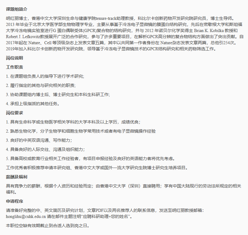 【课题组简介】 胡红丽博士,香港中文大学深圳生命与健康学院tenure-track助理教授,科比尔卡创新药物开发研究院研究员,博士生导师。2013 年毕业于北京大学医学部生物物理学专业,主要从事基于冷冻电子显微镜的膜蛋白结构研究,先后在密歇根大学和斯坦福大学冷冻电镜实验室进行G 蛋白偶联受体(GPCR)复合物的结构研究,并与 2012 年诺贝尔化学奖得主 Brian K. Kobilka 教授和Robert J. Lefkowitz教授展开广泛的合作研究,参与了许多重要项目,在解析GPCR高分辨的复合物结构方面做出了突出贡献。自2017年起在 Nature、Cell 等顶级杂志上发表文章五篇,其中以共同第一作者身份在 Nature杂志发表文章两篇,总他引254次。2019年加入科比尔卡创新药物开发研究院,领导基于冷冻电子显微镜技术的GPCR结构研究和相关药物筛选工作。 【工作职责】 1. 在课题组负责人的指导下进行学术研究; 2. 履行指定的其他与研究相关的职责; 3. 协助课题组内博士后、博士研究生和本科生科研工作; 4. 承担上级指派的其他任务。 【岗位要求】 1. 具有生命科学或生物医学相关学科的大学本科及以上学历,成绩优良; 2. 熟悉生物化学,分子生物学和细胞生物学常用技术或者有电子显微镜操作经验 3. 良好的中英双语沟通、写作能力; 4. 具备良好的人际交往、沟通及组织能力; 5. 具备高校或教育行业相关工作经验者,有项目申报经验及良好的英语能力者将优先考虑。 工作优秀者积极推荐申请本研究组、香港中文大学或国外一流大学研究生院博士研究生培养项目。 【薪酬及福利】 具有竞争力的薪酬,根据个人资历和经验而定;由香港中文大学(深圳)直接聘用;享有中国大陆现行的劳动法所规定的相关福利。 【申请程序】 请准备好完整的中、英文简历及研究计划,文章PDF以及两名推荐人的联系信息,发送至胡红丽教授邮箱:honglihu@cuhk.edu.cn 请在邮件主题注明“应聘科研助理+您的姓名”。 本职位空缺有效期截止到合适人选到岗之日。 招聘广告.png [ 来自版块群 广东 ] |