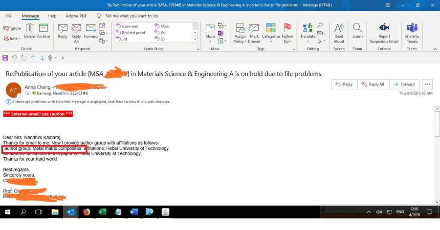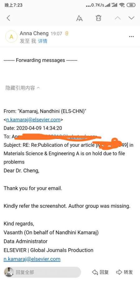 论文投的爱思唯尔,已经被编辑接受了,但是出版部发信来说 Author group was missing 请问 Author group 指什么啊 我导师给他们回复了我们的研究方向,但好像还是不对。十分着急。有遇到类似情况的吗 图1是出版部门的来信,图二是图一来信的附件,红框是出版部的人画出来的 发自小木虫Android客户端 |
