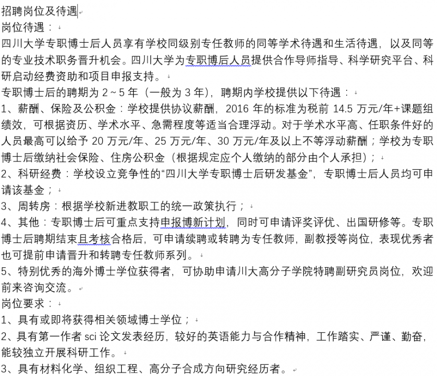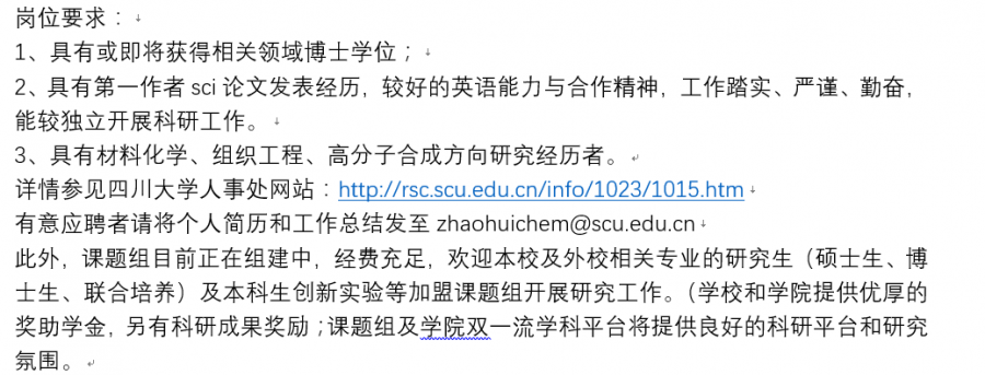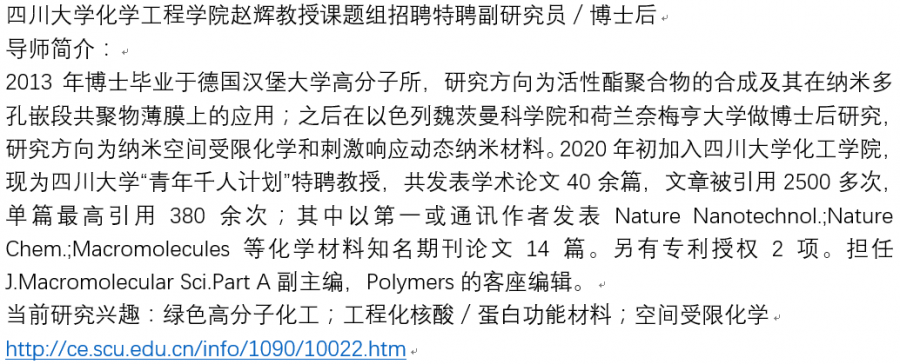 四川大学化学工程学院赵辉教授课题组招聘特聘副研究员/博士后