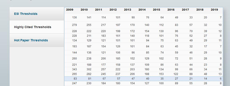 | esi 高被引和热点论文 每两个月更新一次。这个阈值不是应该和月份有关系么,1月份和12月份发表的文章,阈值肯定不同,为什么在ESI上查到的阈值只和年份有关,和月份无关 |