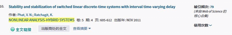 比如我查到大类为数学的一个期刊nonlinear analysis hybrid systems,ESI查到2011年的阈值是67,但这篇文章2011年11月份发表,引用79,还不是高被引 发自小木虫IOS客户端 |