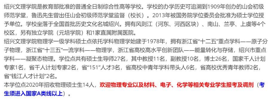 2020绍兴文理学院物理学硕士点接受调剂研究生
