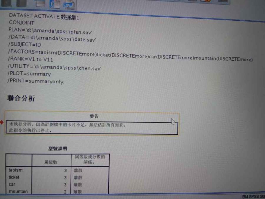 SPSS联合分析输入语法后,发出警告不能运行:因计划档中的卡片不足,无法估计所有因素。这种情况要怎么办啊?